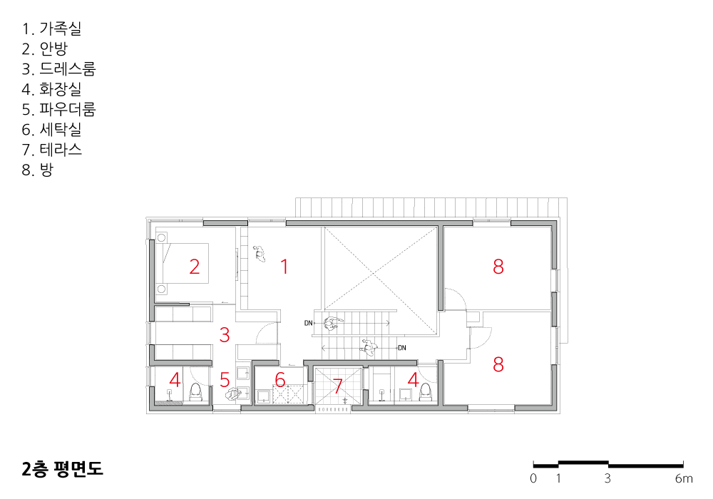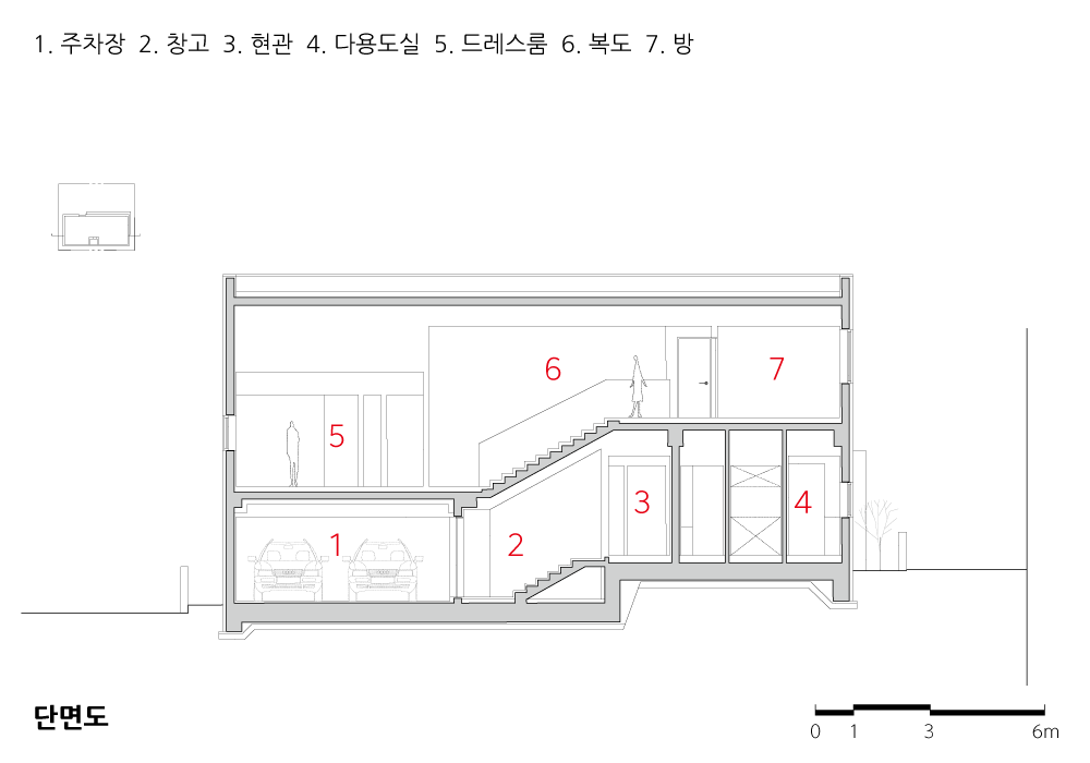 지상 2층의 규모이지만 서로 다른 레벨로 층을 구분하면, 0.5층, 1층, 1.5층, 2층까지 4개의 층으로 구분할 수 있다. 반층씩 연결되는 중심에는 거실이 위치하는데, 연결 동선이 시각적으로 보이고 각층의 일부가 거실과 소통하기에 입체적으로 열린 거실 공간이 만들어졌다. 가족들은 어느 위치, 어느 층에 있더라도 주거의 내부광장인 거실과 소통할 수 있다. 제일 낮은 레벨에 위치하는 0.5층에는 주차장(실내)이 계획되어 있고, 주차장에서 현관으로 진입할 수 있는 동선이 계획되어 있다.