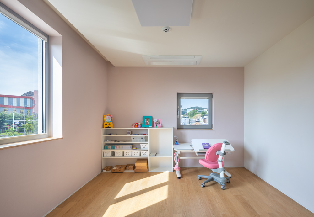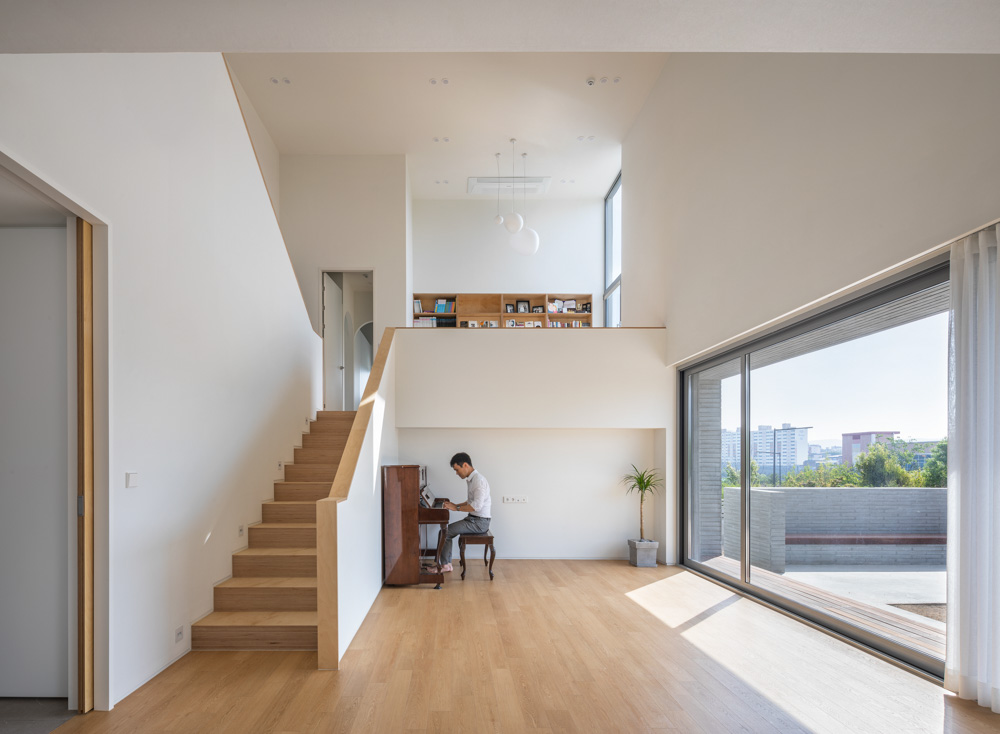 The client wanted a house with minimal necessary space within a limited budget. It is because of a tight budget and, at the same time to have a large yard. Therefore, to reduce the budget, the area had to get smaller first, and the ‘ㅡ’-shaped plane that can minimize the corridor, which is a connecting movement flow and a common space, was the most efficient and suitable plane for the client. The level difference of the site becomes a factor that allows for various plans when designing. For example, if you plan with a skip floor, the area of connecting movement flow is minimized, and the 1st, 1.5th, and 2nd floors are visually connected and physically closely connected, reducing the burden of moving between floors. Although it is two stories above the ground, if the floors are divided into different levels, it can be divided into four floors: 0.5, 1, 1.5, and 2. The living room is located at the center, connected half-floor by half-floor. A three-dimensional open living space has been created because the connecting movement flow is visible. A part of each floor communicates with the living room. Therefore, the family members can communicate in the living room, the inner plaza of the dwelling, no matter where they are located or on any floor. A parking lot (indoor) is planned on the 0.5th floor, the lowest level and access from the parking lot to the entrance is planned. On the first floor, an entrance, a living room, a kitchen, and a multi-purpose room would play the role of a common space connected to the yard through the veranda. The 1.5th floor is the main space for the family. Since there is a master bedroom, a dressing room, a bathroom, a laundry, and a family room, the first and 1.5 floors are the main activity space in this house until the children grow up and use their rooms. On the second floor, there are two children's rooms and a bathroom.