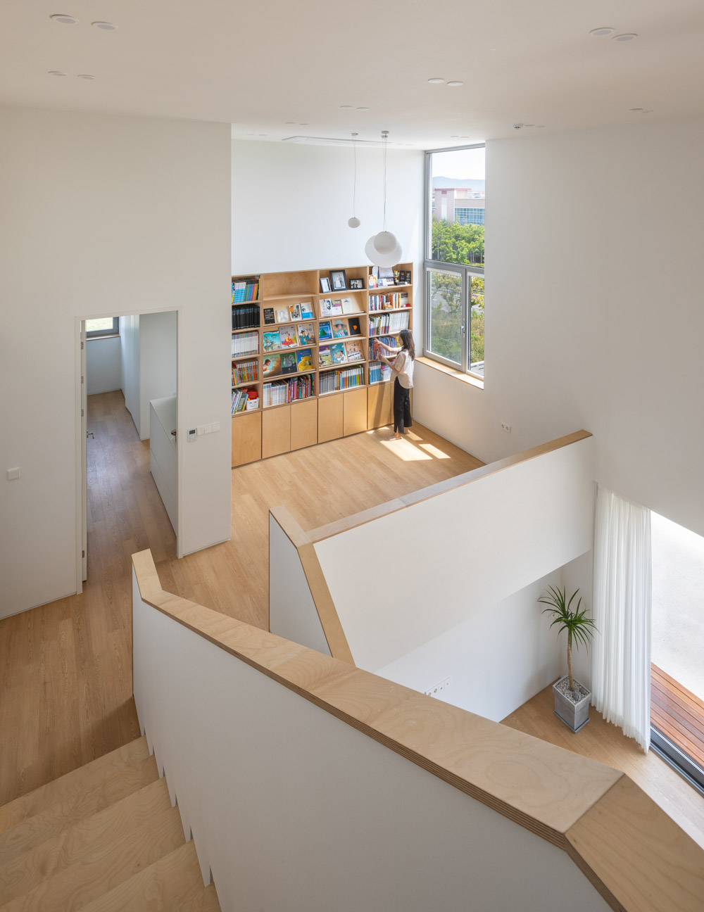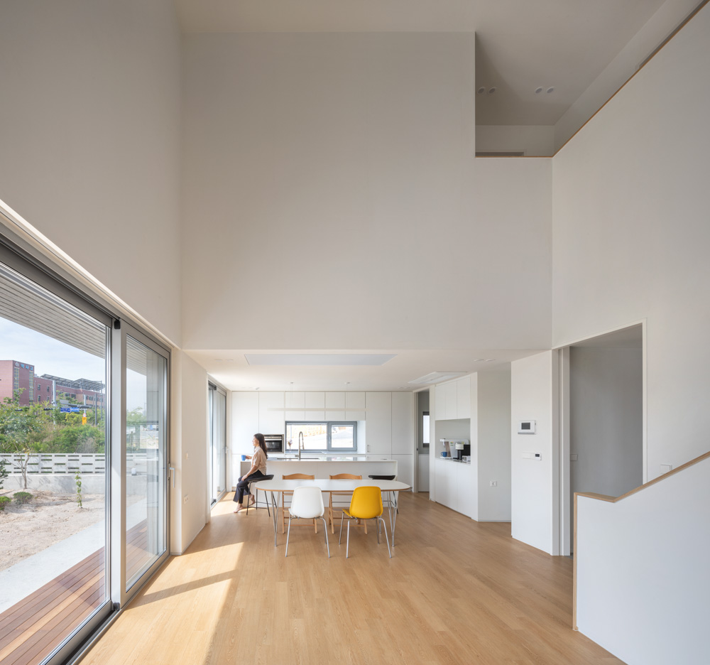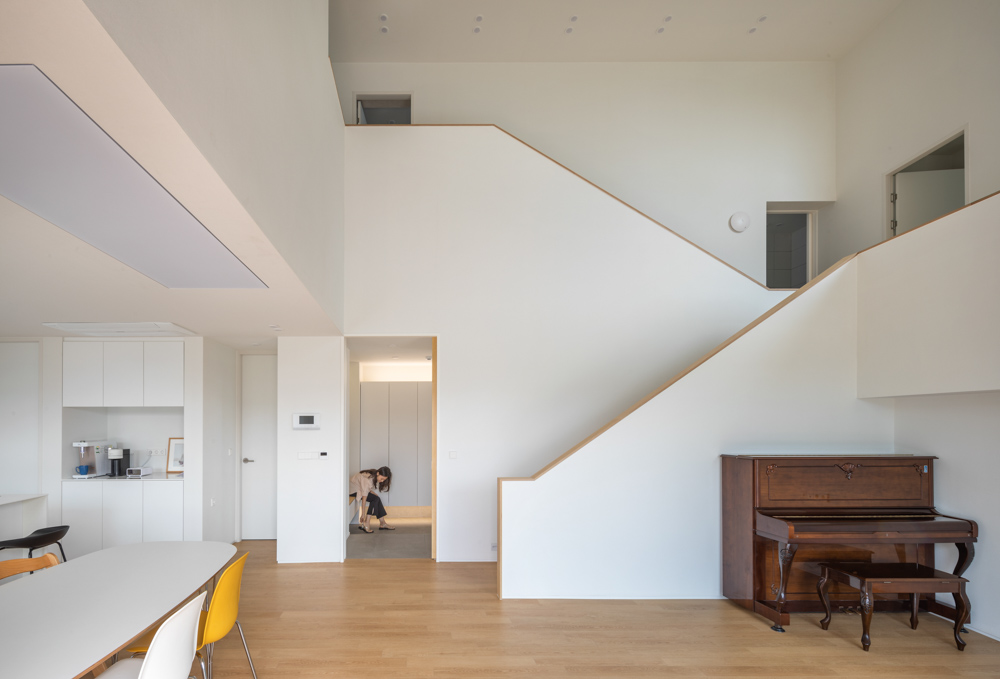 An increasing number of clients in their 20s and 30s would live in detached houses with a yard instead of an apartment. The young client doesn't have a bid budget. The material of exterior walls could be stucco, an exterior insulation system that is easy to select within a limited budget. White stucco was used as the main material of exterior walls, and the facade was partially designed using cement brick tiles, gray stucco, and wood. Wood was used in buffer space as a highlight at the entrance on the first floor to avoid rain so that the building filling the long side of the site does not look stuffy in the direction of the north front road. On the second floor, there is sufficient light through the veranda space in the laundry and the bathroom on the left and right, and windows are designed toward the veranda to block the view from the road. As their housing type has changed from an apartment to a detached house, the client felt most burdened was the vertical movement floor (stairs) connecting the first and second floors, and the client expected the most was a large yard for their children to play about. The most burdensome and anticipated spaces in various design conditions, including room layout, area, budget, laws, and site conditions that the client wanted, were solved through skip floor. A variety of levels could be in a simple rectangular mass.