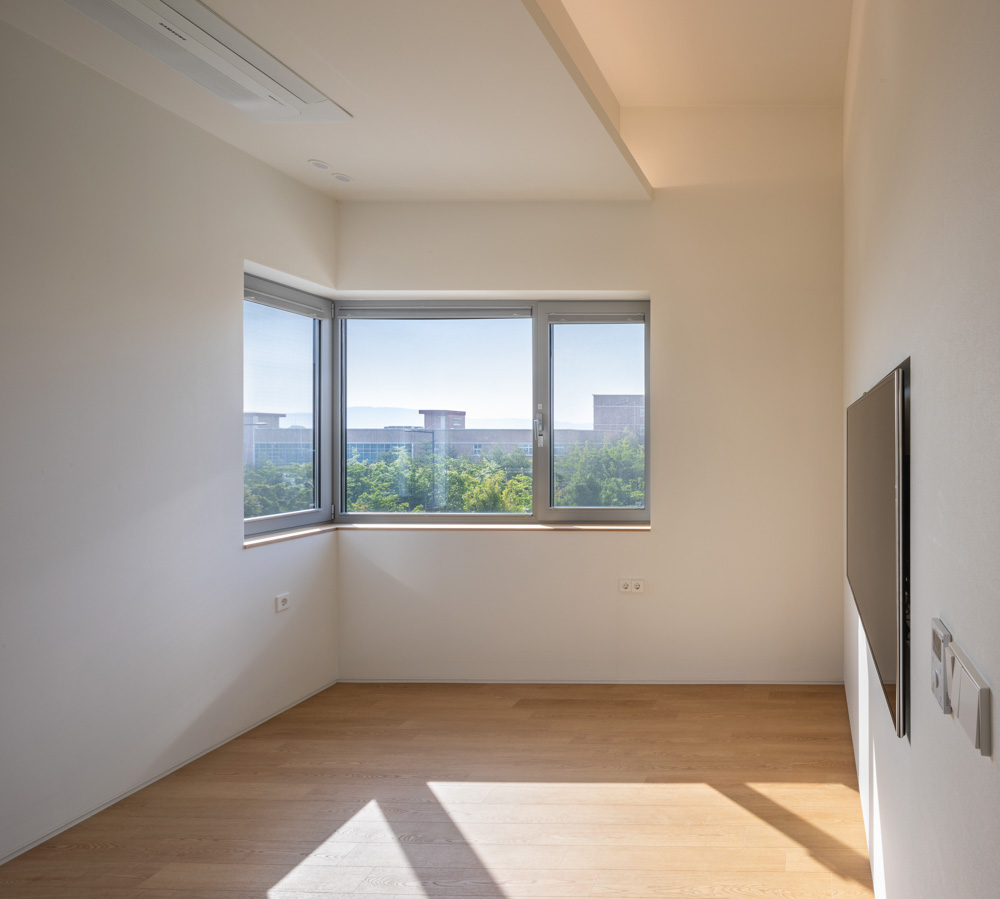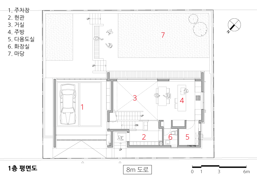 북서측으로는 8미터 도로가, 남동측으로는 공원이 접해있는 대지는 온전히 남향 빛을 받는 동시에 공원 방향으로 프라이버시도 보호받을 수 있는 장점이 있는 대지였다. 그러나 도로의 가중평균레벨보다 대지의 가중평균레벨이 낮은 단점을 가진 대지이기도 했다. 쉽게 이야기해서 건축주는 도로보다 낮은 대지를 구매한 것이다. 추후 조성될 좌·우측의 인접대지 레벨을 고려하고 토목공사를 최소화하는 방향으로 대지 내 레벨 차이를 활용해야 했다. 도로를 기준으로 대지를 바라보았을 때 도로의 경사를 활용하여 좌·우로 두 개의 레벨을 정했다. 좌측의 낮은 레벨은 주차장 출입구를 계획하였고, 우측의 높은 레벨은 주거공간의 주출입구를 계획해 주거공간이 도로의 레벨보다 낮지 않게 계획하였다. 두 개의 레벨로 조성된 외부공간은 각 레벨에서 내부공간으로 연결된다.