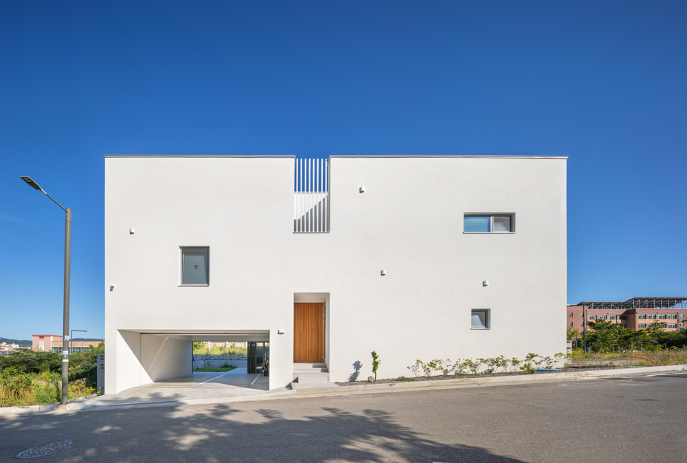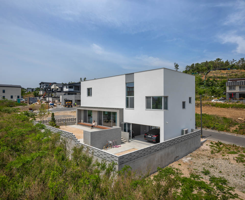 아파트를 벗어나 마당이 있는 단독주택에 살기를 원하고 실행하는 20~30대 건축주가 증가하고 있다. 젊은 건축주는 예산이 넉넉하지 못하다. 한정된 예산 속에 쉽게 선택할 수 있는 외벽재료가 외단열공법인 스타코일 것이다. 흰색 스타코를 주요 외벽재료로 사용하였고, 부분적으로 시멘트벽돌타일, 회색 스타코, 목재를 사용하여 입면을 디자인했다.