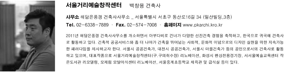 | 서울거리예술창작센터 리노베이션 설계자 | 백창용 _ 해담은풍경 건축사사무소 건축주 | 서울특별시장 감리자 | 백창용 _ 해담은풍경 건축사사무소 시공사 | 위니드건설(주) 설계팀 | 강한솔 대지위치 | 서울특별시 광진구 아차산로 710 주요용도 | 교육연구시설, 취수시설 대지면적 | 17,838.00㎡ 건축면적 | 3,339.13㎡ 연면적 | 5,060.81㎡ 건폐율 | 18.72% 용적률 | 20.53% 규모 | 지하 1층, 지상 3층 구조 | 철근콘크리트조, 철골조 외부마감재 | 전벽돌, 니아또 루버, 기존 지붕기와 재활용 내부마감재 | 친환경페인트, 낙엽송합판 설계기간 | 2017. 12 ~ 2018. 07 공사기간 | 2018. 09 ~ 2019. 06 사진 | 박성희 _ FACE Studio, FLYIST 드론팀 구조분야 : (주)BASE 구조기술사사무소 기계설비분야 : (주)보우엔지니어링 전기분야 : (주)건창기술단 소방분야 : (주)보우엔지니어링 |