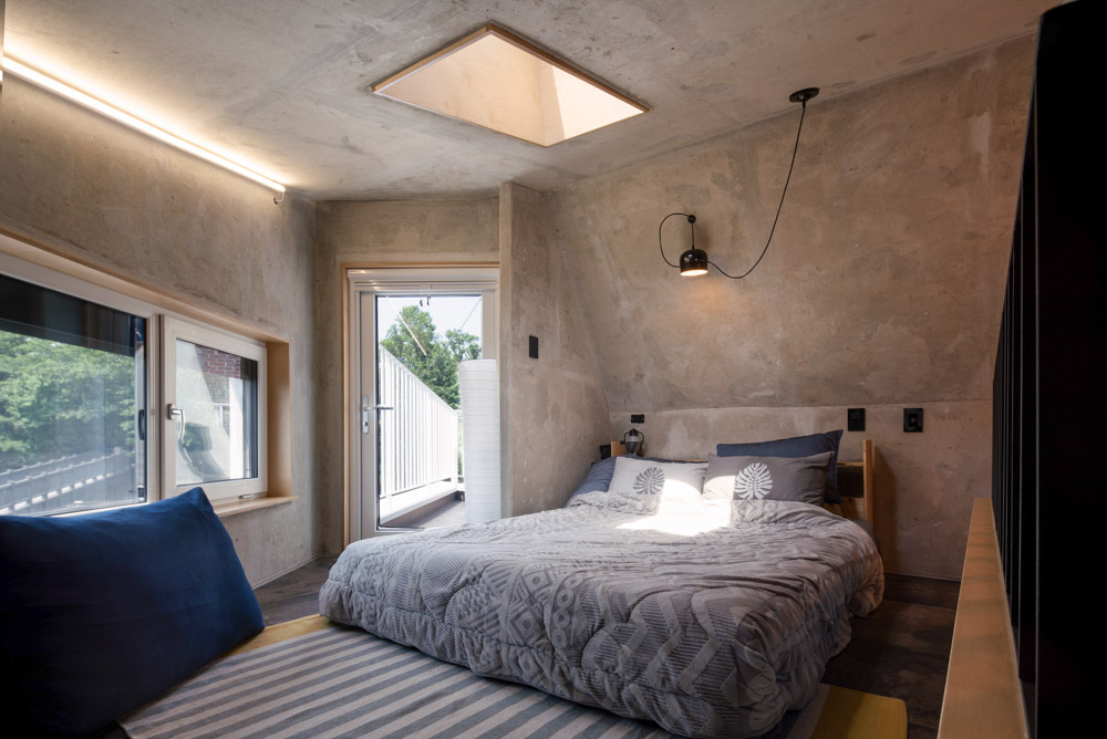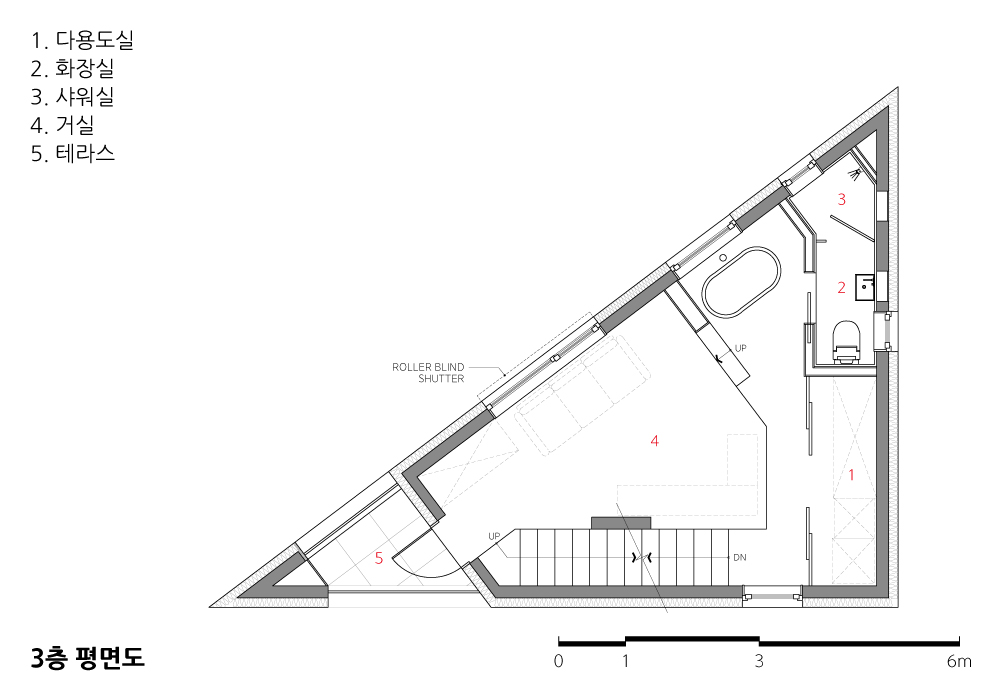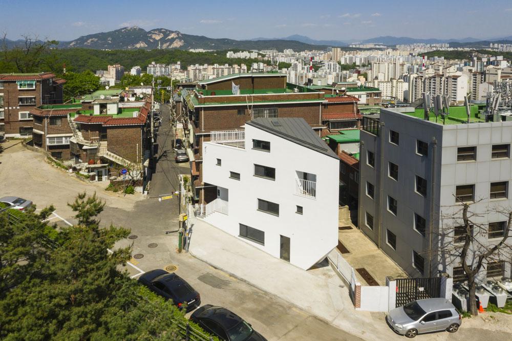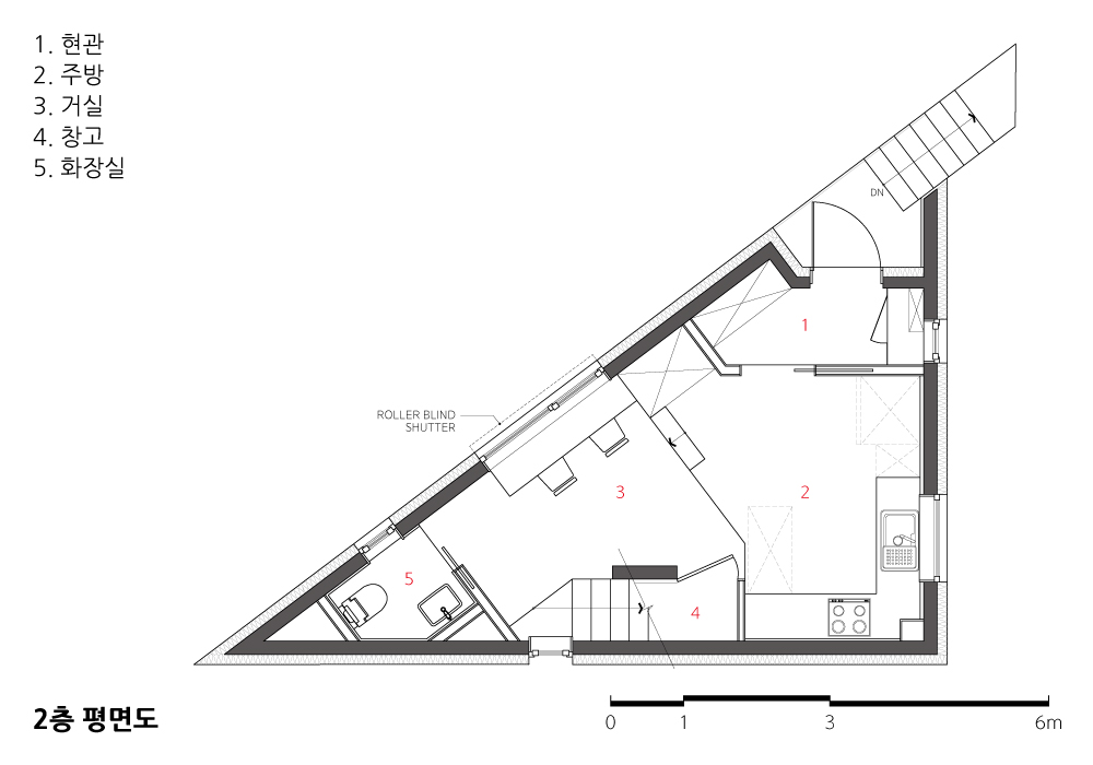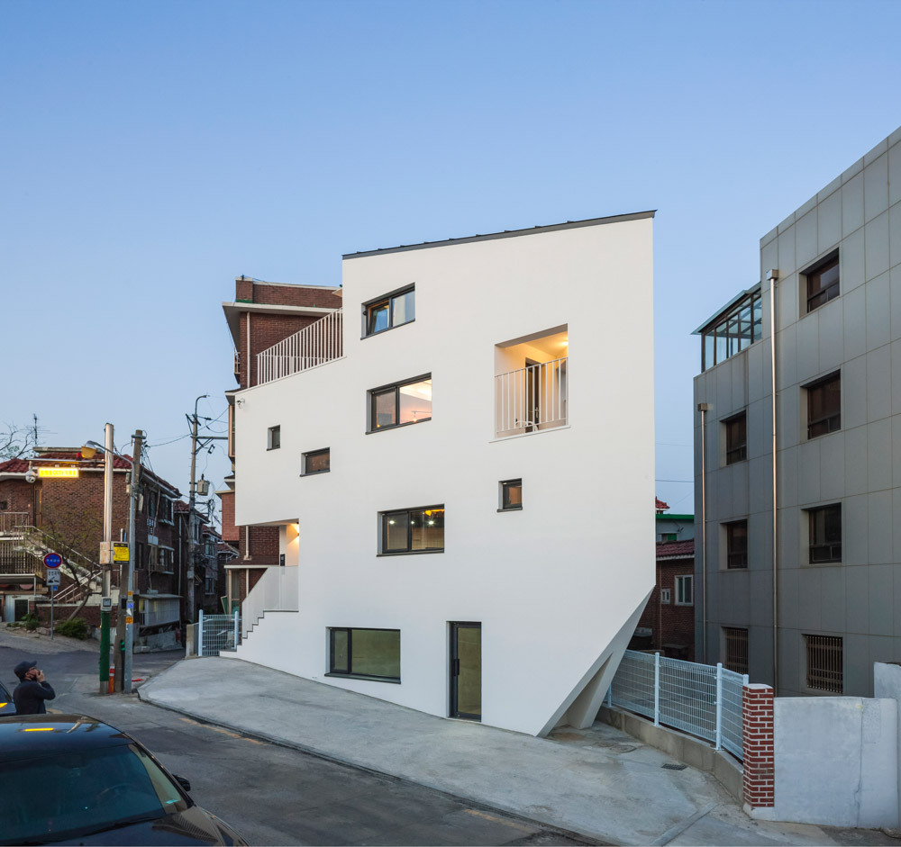 1층에 작은 상가를 두게 된 이유는 임대소득도 기대할 수 있으며 용도별 주차대수 산정식이 다르기 때문에 주택의 면적(50제곱미터 미만)을 최소화하기 위한 선택이었다. 2층에서 1층으로 벽이 사선으로 꺾이는 부분은 정화조, 계량기 등을 설치할 땅의 면적을 확보하기 위한 디자인적인 요소이다. 이렇듯 이 집은 땅의 모양을 그대로 받아들여 지어야 하면서도 유니크한 디자인이 돋보이도록 고민한 집이다.