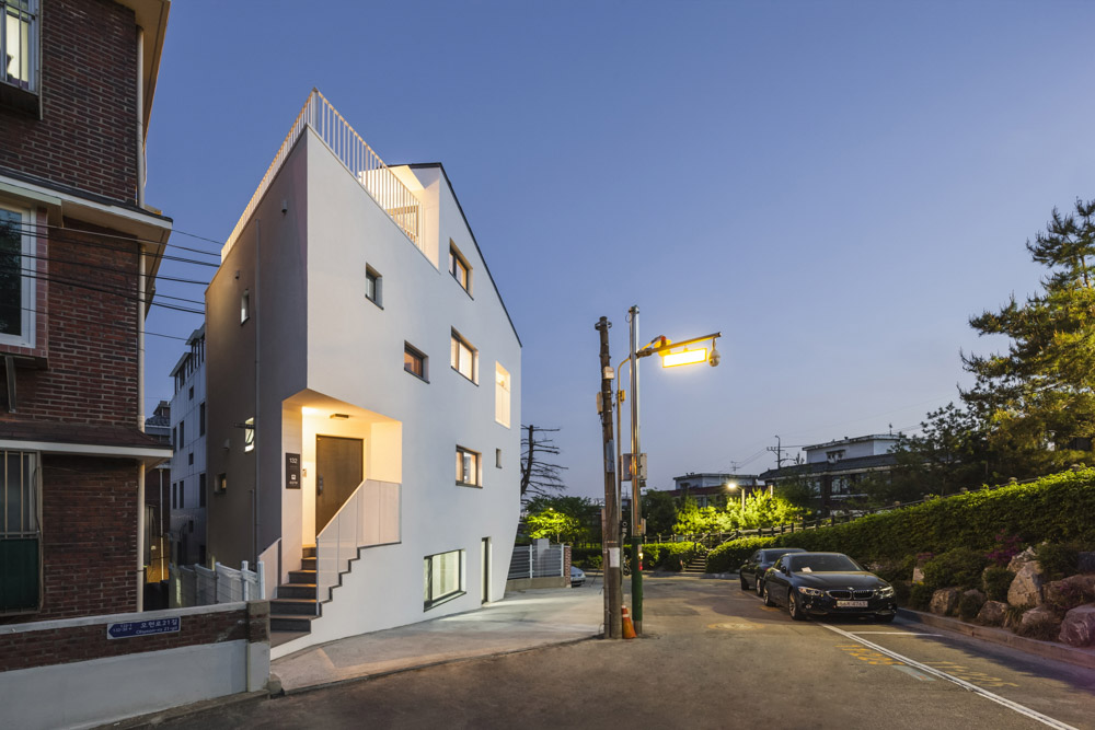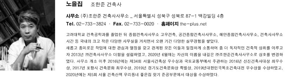| 노을집 설계자 | 조한준_(주)조한준 건축사무소 건축주 | 구정은, 양지욱 시공사 | 건축주 직영공사 설계팀 | 손미화, 최다은 대지위치 | 서울특별시 강북구 오현로 21길 132(번동) 주요용도 | 단독주택 대지면적 | 56.00㎡ 건축면적 | 33.37㎡ 연면적 | 78.89㎡ 건폐율 | 59.58% 용적률 | 140.88% 규모 | 지상 3층 구조 | 철근콘크리트 벽식구조 외부마감재 | 스토 외단열시스템(HAOS Stolit K2.0 Lotusan white) 내부마감재 | 콘크리트 노풀 면처리 / 석고보드위 수성페인트 설계기간 | 2019. 07 ~ 2019. 10 공사기간 | 2019. 12 ~ 2020. 05 사진 | 정우철 구조분야 : 한길엔지니어링 기계설비분야 : 지엠이엠씨 전기분야 : 지엠이엠씨 소방분야 : 지엠이엠씨 |