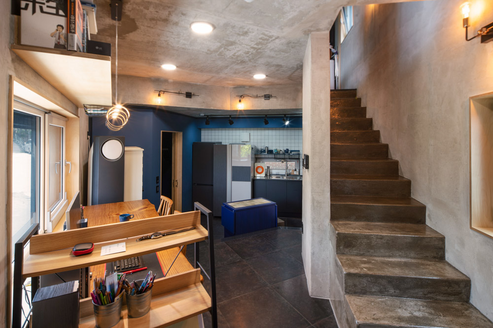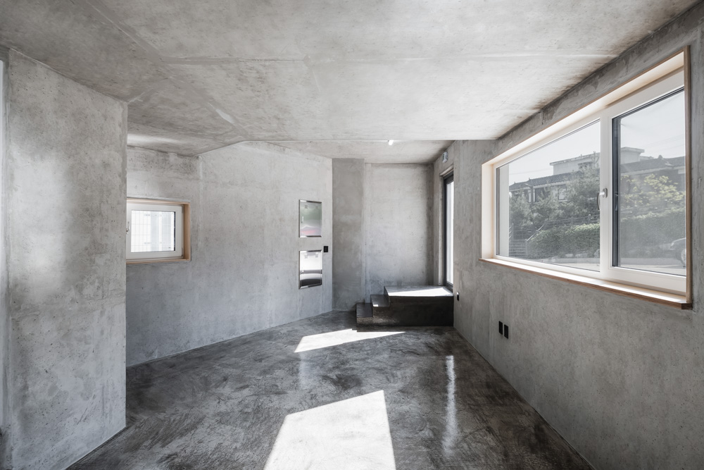 We had to construct the building's outer wall as the main structure to secure indoor space. We selected a reinforced concrete wall structure that is free in form and highly rigid. Upon the client's desired concept of 'a house that doesn't look like a house', the interior finish was made rough through concrete exposure to the wall and surface treatment. In contrast, the exterior finish was made with STO external wall insulation and bright white Lotusan paint. It is intended to give reversal you can't expect when you enter the house. It is a space made of the harmony of the color and texture of floor tiles matching the color of the gray wall and the balance of the partially used paint and lighting color.