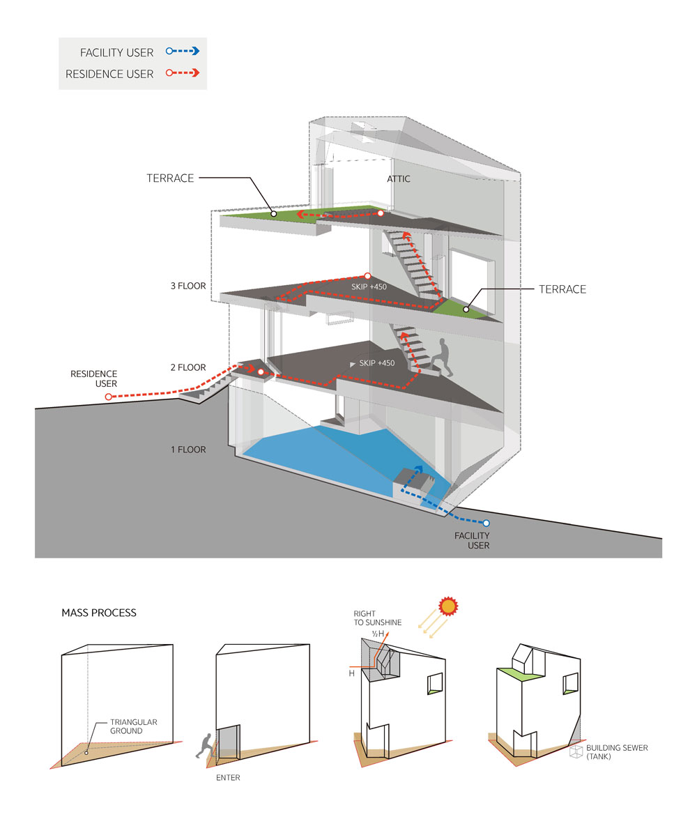 집이 지어지기 전 대지는 아주 오래전에 지어진 단층짜리 구옥이 있었다. 구옥은 대지의 경계선을 벗어나 땅보다 더 크게 자리 잡고 있었다. 지적도상의 대지 형태는 완전한 삼각형이었고, 땅의 크기는 고작 16.7평(55제곱미터)이었다. 이런 작은 땅에서 건물의 배치는 이미 정해져 있다. 다만 출입구의 위치와 실내공간구성 배치에 더 신경을 써야 한다. 작은 땅은 지을 수 있는 최대의 건축면적을 찾아야만 하고, 법이 허용하는 최대의 면적을 확보해야 하기 때문이다. 하지만 출구의 위치와 내부공간 배치, 계단의 배치 등에 따라 외부에서 보이는 건물의 형태와 이미지가 결정된다. 작은 땅은 여유가 없다 보니 사실 주거로서의 기능을 위해 절대적으로 필요한 기반시설이 집을 짓는데 제약조건이 되기도 한다. 예를 들어 정화조는 굉장히 컴팩트해야 하지만 막상 땅에 자리 잡을 만한 여유가 없다. 또한 수도계량기도 설치해야 할 땅이 부족하니 어딘가 묘수가 없는지 고민해야 한다. 건물 밖으로 배출되는 하수나 우수처리에 관련된 맨홀과 배관의 경로가 건물 주변으로 배치가 되는지도 고민이다. 보일러실은 위치에 따라 가스배관이 용이하거나 건물 전면에 노출되지 않도록 해야 한다. 건물의 규모를 결정짓는 가장 큰 요소인 주차장은 너무 작은 땅이니 면제받을 수 있는 방법을 고안해야 했다.