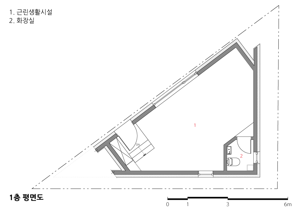There was a single-story house on the site before. The old house was located larger than the land out of the boundaries of the site. The land shape on a cadastral map was entirely triangular, and the size was only 16.7 pyeong(55 ㎡). In this small land, the building layout was already fixed. However, we had to pay more attention to the entrance and the design of the indoor space. This is because a small land must secure the most extensive building area to the law's fullest extent. However, the shape and image of the building seen from the outside are determined based on the exit location, the layout of the indoor space, and the design of stairs. The infrastructure necessary to function as a residence may be a constraint on building a house since there is no room for small land. For example, a septic tank should be very compact, but there is no room to settle in the ground. Also, the land area to install a water meter is not enough, so we have to devise great alternatives. It is also a concern whether the paths of maintenance holes and pipes for sewage or rainwater discharged out of the building are arranged around the building. Depending on the boiler room location, gas piping should be easy to access or not exposed to the front of the building. The parking lot, which is the most significant factor in determining the building's size, is too small, so we had to devise a way to get an exemption.