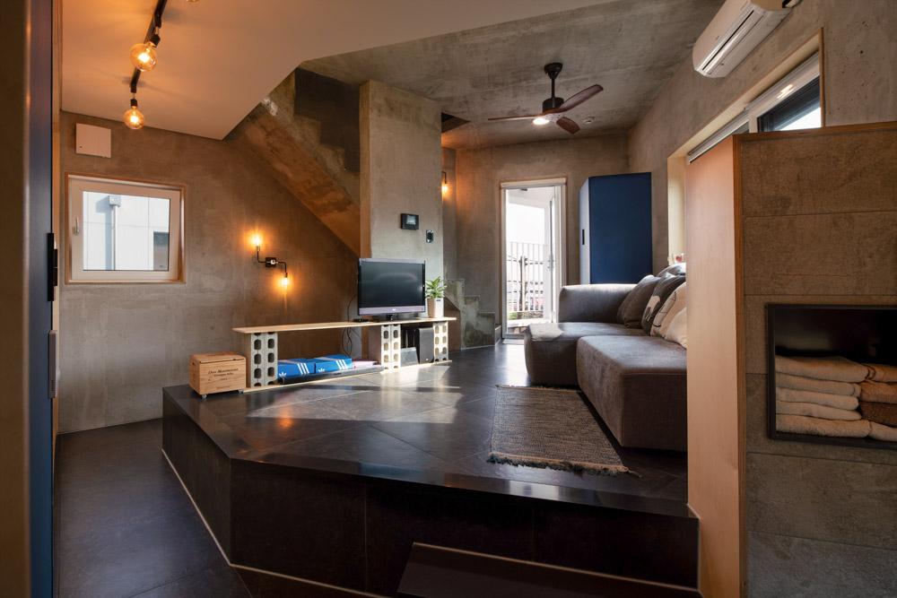 The client’s choice or taste was unique. The most crucial factor in building a house is to see the evening sky through a large window in the west, which most prospective architects are reluctant to do. The client also wants to make “a house that doesn’t look like a house” with the interior’s dark tone. Although all spaces are divided by floors, they are smoothly connected.