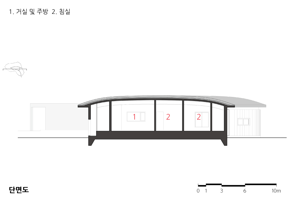 The floor plan of the building was shaped by offsetting the outline of the irregular shaped ground. Offsetting heart-shaped site resulted a roof in a smooth curve of lips. The lip-shaped roof is not recognizable on the ground at eye level. The figure, which can only be seen from the sky, seemed to symbolize the strong femininity of Jeju Island, which endured countless rain and wind. Reflecting the simple movement of the owner entering the house for daily rest, the entrance to the house was placed at the east end, and a triangular bathroom with an ocean view at the west end. The rest are two rooms, a living room, a kitchen, and other general functions for a simple life. The interior space made of a gentle curved wall is warm like a calm mother's arms, and is filled with the sun, wind and sea that is the nature of Jeju.