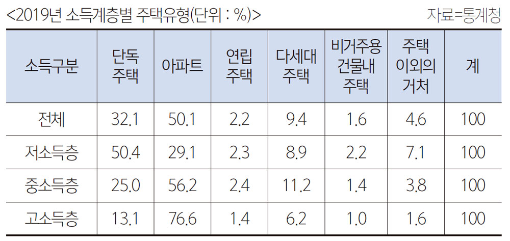 우리나라 국민의 주택유형별 거주 비율에서 아파트 거주 비율은 50%를 넘어섰고, 국토교통부가 발표한 2019년 주거실태조사의 지역별 소득계층별 주택유형에 따르면 아파트에 거주하는 비율은 저소득층은 29.1%, 중소득층 56.2%, 고소득층 76.6%로 고소득자일수록 아파트에 거주하는 비율이 높다. 계속되는 집값 상승과 까다로워진 대출 여건들을 고려하였을 때 이 비율은 점차 양극화가 두드러질 것으로 보인다. 건축주들의 대다수가 고소득층인 것을 감안하면 아파트 인테리어는 건축사사무소와 무관하지 않다.