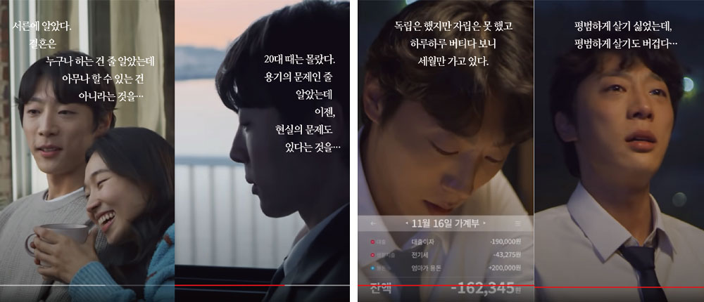 광고의 주인공은 서른이 된 회사원이다. 원룸에 혼자 살고 있는데 대출이자와 생활비를 내면 엄마의 용돈이 들어와도 잔고는 언제나 마이너스다. 전셋집 구할 길이 막막해 여자 친구와 헤어지고, 좀 더 조건이 좋은 직장을 찾기 위해 경력직 채용공고를 검색한다. 새벽 한 시가 훌쩍 넘어서까지 잠 못 들어 뒤척이고, 같은 날 새벽 여섯 시 알람에 시작된 긴 하루를 마치고 귀가한 서른의 젊은이… 어둠이 가득 찬 좁은 집에 넥타이도 풀지 않고 멍하니 앉아 그는 속으로 중얼거린다. 독립은 했지만 자립은 못 했고, 평범하게 살기 싫었는데 평범하게 사는 것조차 버겁다고.