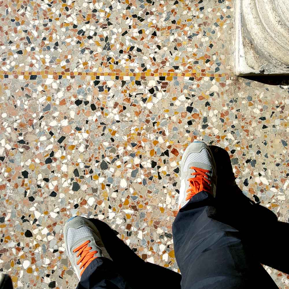 그렇다면 ‘테라조 물갈기’의 ‘테라조’는 무엇인가? 테라조(TERRAZZO)는 다양한 색깔의 종석을 모르타르와 섞어 바른 후 표면을 연마하여 가공한 인조석을 지칭하는 용어다. 대리석을 생선전에 비유한다면, 테라조는 어묵과 비슷하다. 어묵에 야채나 문어를 넣어 풍미를 더하는 것처럼, 테라조는 종석(chips)으로 대리석이나 색깔 있는 돌조각 또는 유리 같은 반짝이는 재료를 섞기도 한다. 고대 이집트 시대부터 있었던 모자이크 장식이 변형되어 18세기 베니스에서 완성된 이 복합 재료는 종석(chips)으로 형형색색 알갱이를 사용해서 아름답기도 하고, 표면을 가공하는 숙련공이 많이 필요하기 때문에 고가의 건축재료였다. 베니스 최고 권력자의 공간이었던 두칼레 궁을 방문한다면, 발아래로 시선을 돌려보자. 궁전 곳곳의 바닥이 테라조로 꾸며진 것을 확인할 수 있을 것이다. 20세기에 전기로 작동하는 물갈기 기계가 도입되면서 단가가 낮아졌고, 저렴한 화강석을 종석으로 사용하여 더욱 저렴해져 국내의 학교 복도에서 쉽게 볼 수 있게 된 것이다. 대리석 종석을 사용한 것과 학교 복도를 비교하면 화려함이 덜 한 것이 사실이지만, 가장 못난 테라조만 보고, 테라조라는 재료가 싸구려라고 폄하하면서 스스로 전문가라고 할 수 있을까?