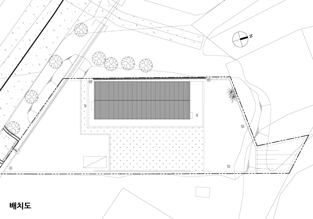 국도에 접한 대지의 길이가 좁아 건축물의 인지성을 향상시키기 위해 박공 모양의 통창을 계획하여 야간에 조명이 주는 시선 이동을 유도하였고, 이를 통해 실내 자연광을 유입하여 채광이 풍부한 실내공간을 연출하였다.