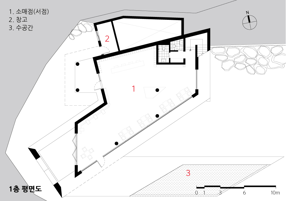 한때 시인이었던 건축주는 자연 속에 서점을 만들고 싶어 했다. 도심에서나 볼 수 있었던 동네 서점을 산속에 두는 상상을 늘 해왔다. 혼자 보기 아까운 비경을 기꺼이 사람들에게 나눠주고 누구나 와서 쉬다 가는, 오감으로 책을 만나고 경험하는 ‘서가’를 꿈꿨다.