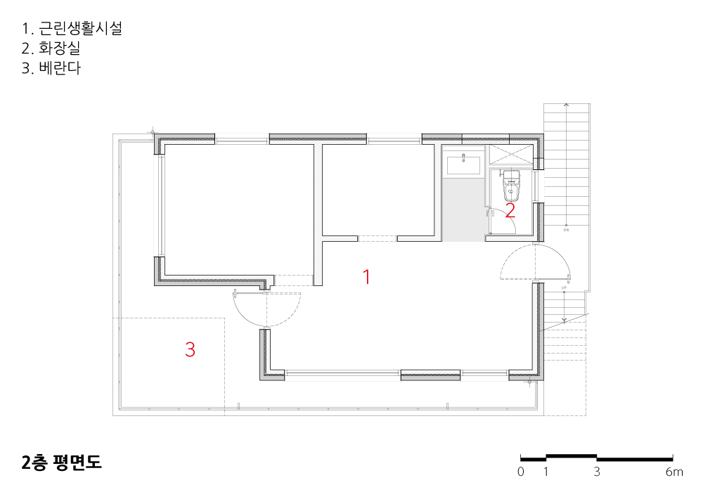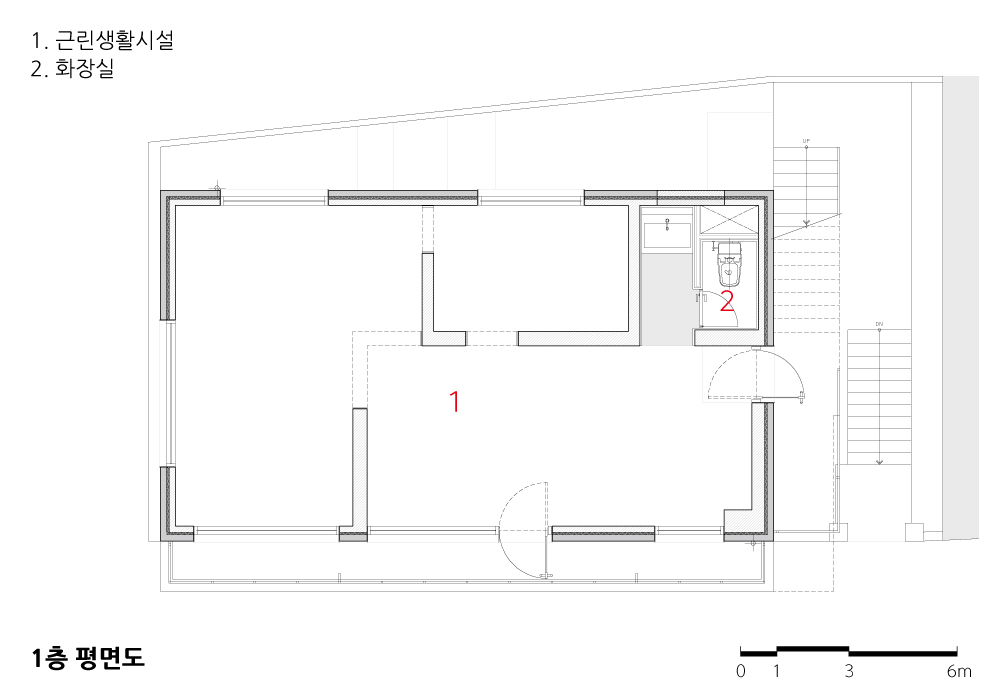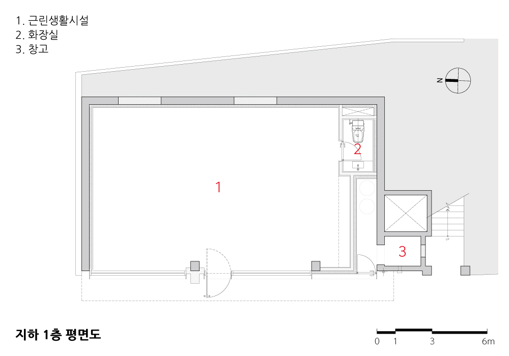 내외부 벽체는 박피를 하듯 마감과 미장, 칠들을 걷어내며 오롯이 공간을 구성하는 날것의 물성을 드러내어 공간이 변모했던 흔적, 혹은 유적과 같은 층위를 마감의 요소로 차용했다. 기존의 외부 철제 난간은 해체와 재구성을 통해 막다른 골목길의 새로운 풍경을 만들어냈다.