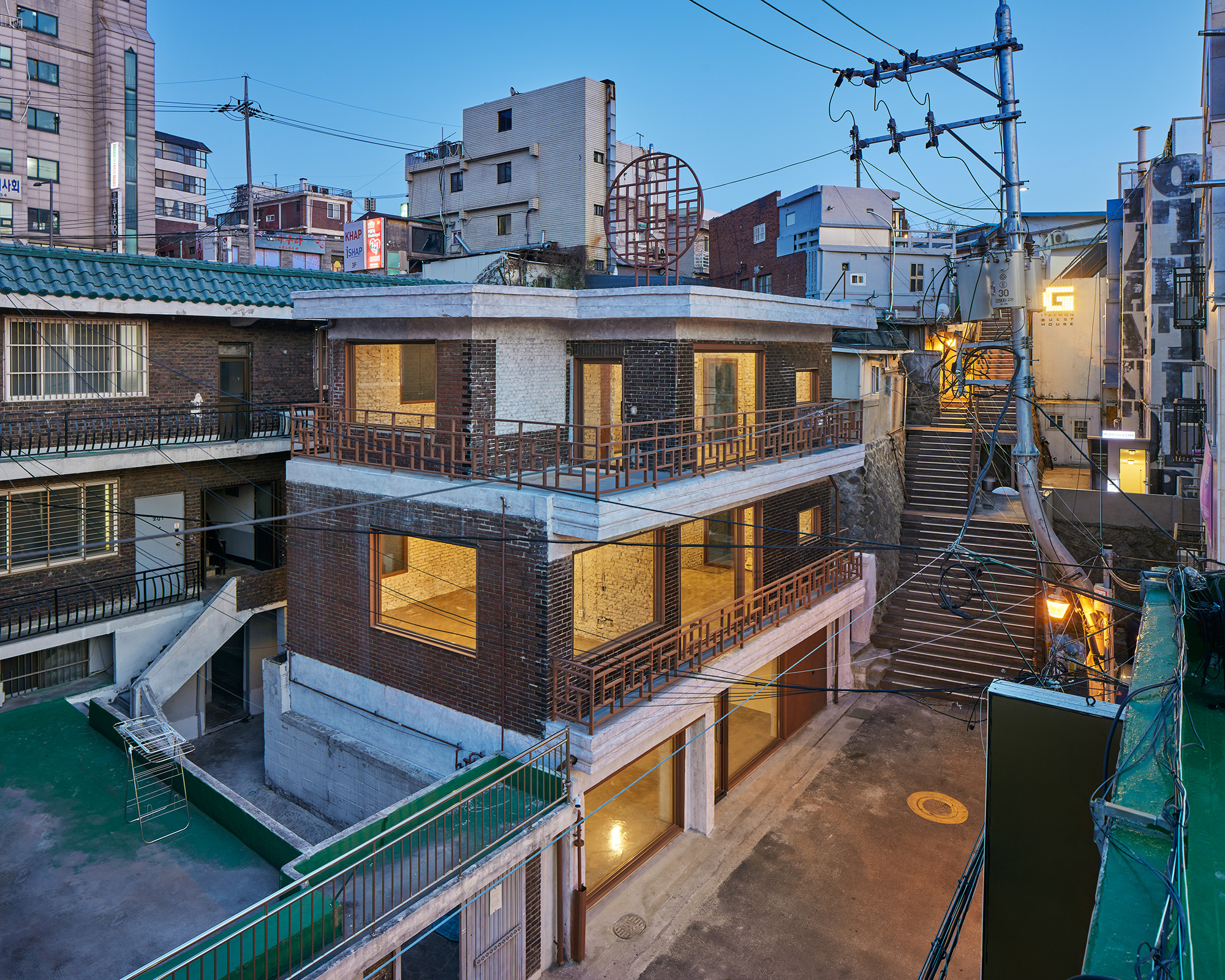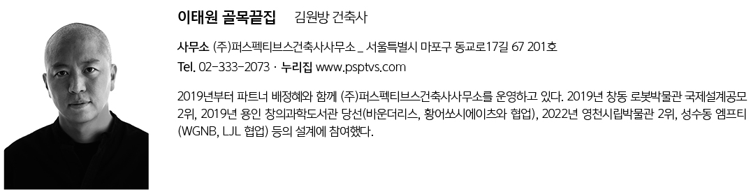 | 이태원 골목끝집 설계자 | 이승진_ (주)엘제이엘건축사사무소 김원방 _ (주)퍼스펙티브스건축사사무소 건축주 | (주)코너스톤브릿지 시공사 | 박종화 설계의도 구현 | (주)엘제이엘건축사사무소, (주)퍼스펙티브스건축사사무소 대지위치 | 서울특별시 용산구 보광로60길 14-13 주요용도 | 근린생활시설 대지면적 | 99.80㎡ 건축면적 | 55.80㎡ 연면적 | 158.08㎡ 건폐율 | 55.92% 용적률 | 102.49% 규모 | B1F - 2F 구조 | 연와조 외부마감재 | 치장벽돌보수, 콘크리트면정리 내부마감재 | 시멘트벽돌노출 설계기간 | 2022. 11 - 2023. 01 공사기간 | 2023. 01 - 2023. 04 사진 | 노경 구조분야 : (주)이든구조컨설턴트 기계설비분야 | 진흥이엔지 전기분야 | 진흥이엔지 |