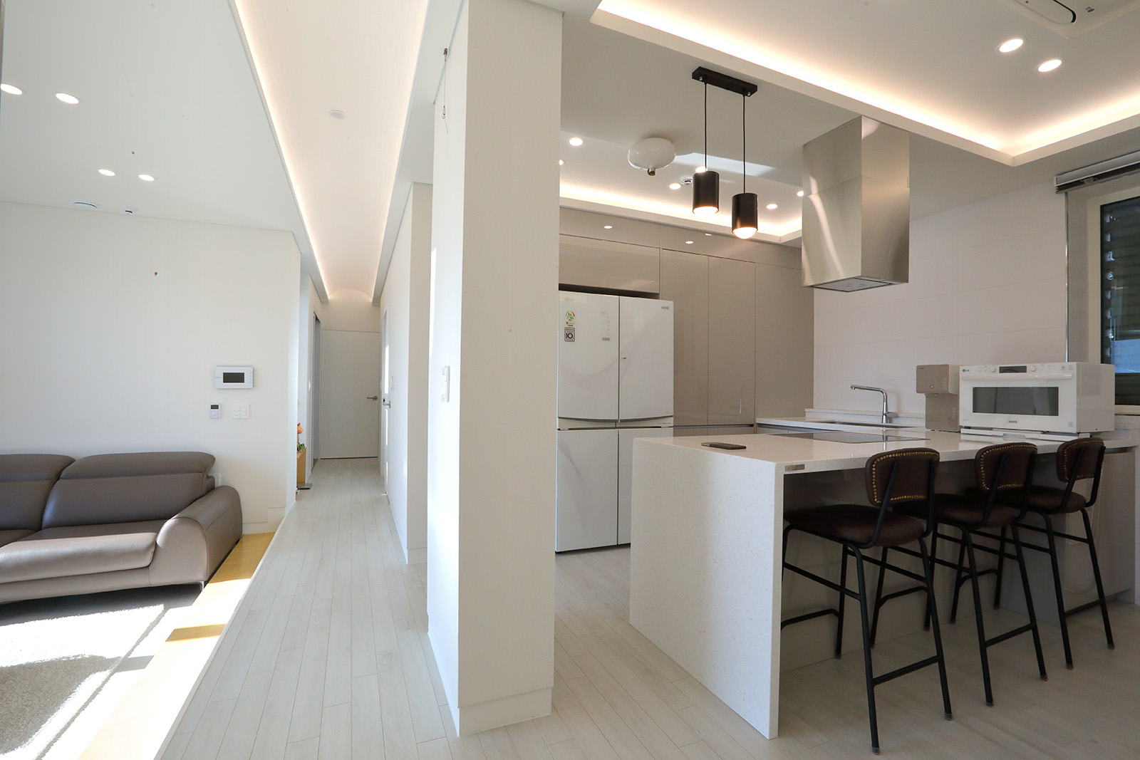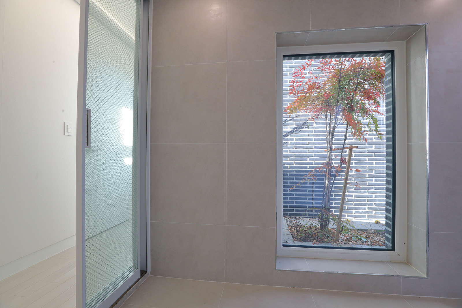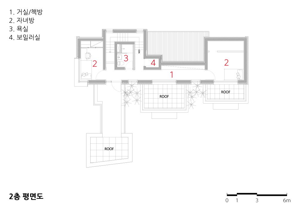 현관으로 진입하면 긴 의자가 현관의 한 면을 차지한다. 신발을 신을 때 가방이나 우산을 들고 있어 손이 모자란 상황을 쉽게 해결한다. 의자 뒤쪽의 긴 수직창은 꽃과 나무를 담은 액자가 된다. 복도를 따라 걷다보면 맞이하는 새로운 영역의 분절점인 디귿(ㄷ)자 영역이 만들어지며, 꽃과 햇볕이 길게 접근한다. 자녀들의 방 한 영역은 취미공간으로 구성되며, 딸 방 앞 테라스와 경관은 선물이다.