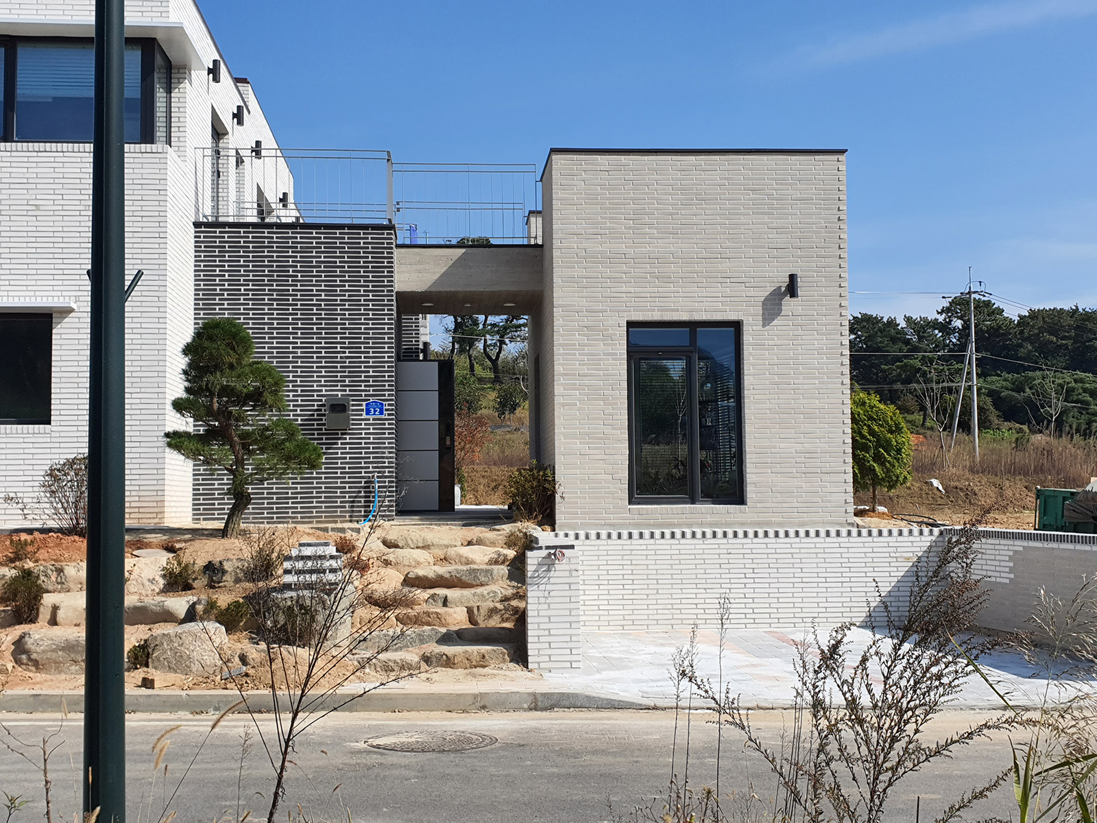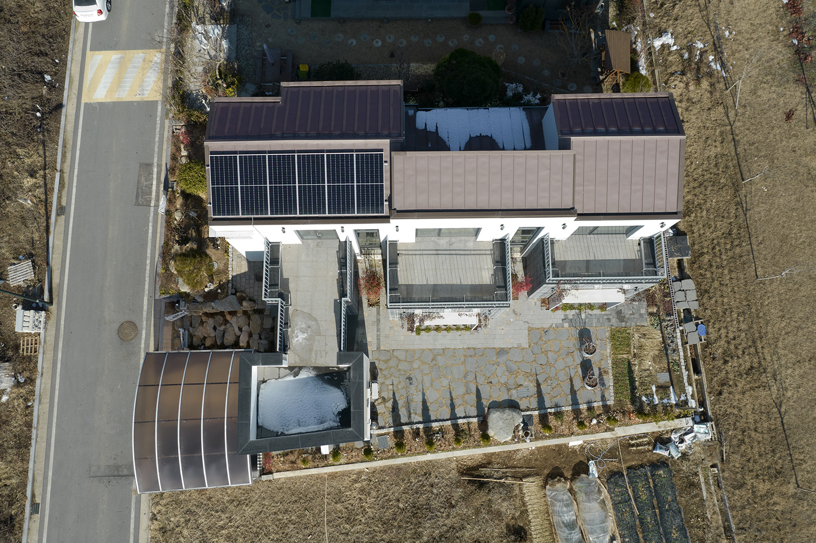 The faces of the surrounding buildings seen from the front road were not part of a preconceived plan. I wanted the building to be memorable. Since views from the left, right, and rear sides are not visible from the road, pedestrians passing by can imagine the stories embedded in the architecture. The family can also create new memories while enjoying the landscape. The space that was created in this manner is the bridge. The bridge connects the main house, the wife's hobby space, the reception area, and the greenhouse area. It not only provides a perspective view but also allows pedestrians on the road to view the void, providing a panoramic view of the nearby hills, while serving as a canopy for the entrance.