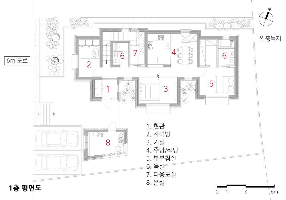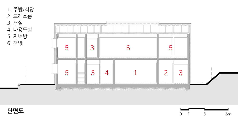 장방형의 대지는 여러 대안을 모색하게 했다. 결과적으로 북서측에 매스, 남측에 마당이 있는 안으로 결정했다. 부부영역은 조망과 프라이버시를 고려해 북측에, 서측 전면도로 측에는 아들방과 주차장, 텃밭이 위치하며 중앙에는 공적공간인 거실과 주방이 있다.