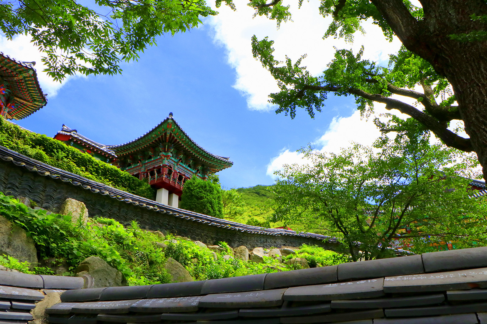 강화도 서쪽, 보문사가 있는 섬 석모도는 유람선을 타야만 갈 수 있던 곳이었다. 수많은 연인들의 추억과 이야기가 담겨 있는 그곳이, 지금은 배를 타지 않고도 차로 쉽게 드나들 수 있는 곳이 되었다. 종종 승용차를 몰고 석모도에 갈 때면 항상 보문사로 향하게 된다. 아주 가파른 언덕으로 일주문을 지나 숨을 헐떡이며 걸어 올라가다 보면, 경사를 따라 길게 이어지는 기와 담장과 담장 위로 기초석을 내민 범종각을 만나게 된다. 녹색의 수풀에 감싸여 수평으로 길게 이어진 담장과 그 위 하늘을 향해 팔 벌린 듯한 추녀 끝이 파란 하늘과 만나 시선이 집중되는 정점이 되어 눈에 들어온다. 낙가산을 배경으로 자리 잡은 보문사의 범종각은 언덕을 올라가는 이들에게 아름다움을 전달하고, 범종각에 올라가서는 염원이 담긴 범종의 울림이 서해를 향해 넓게 퍼지게 하는 듯하다.
