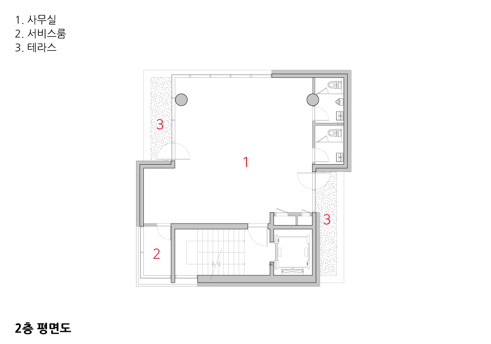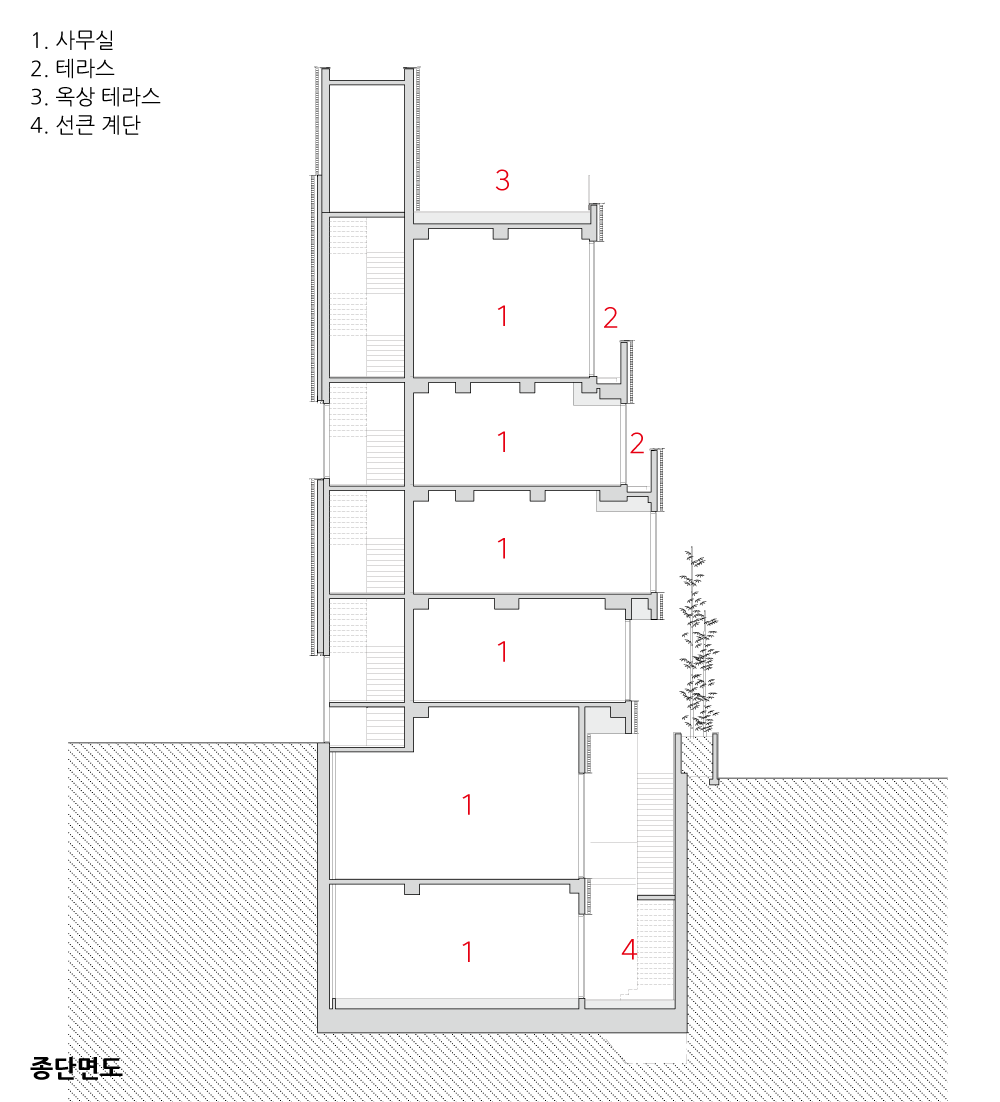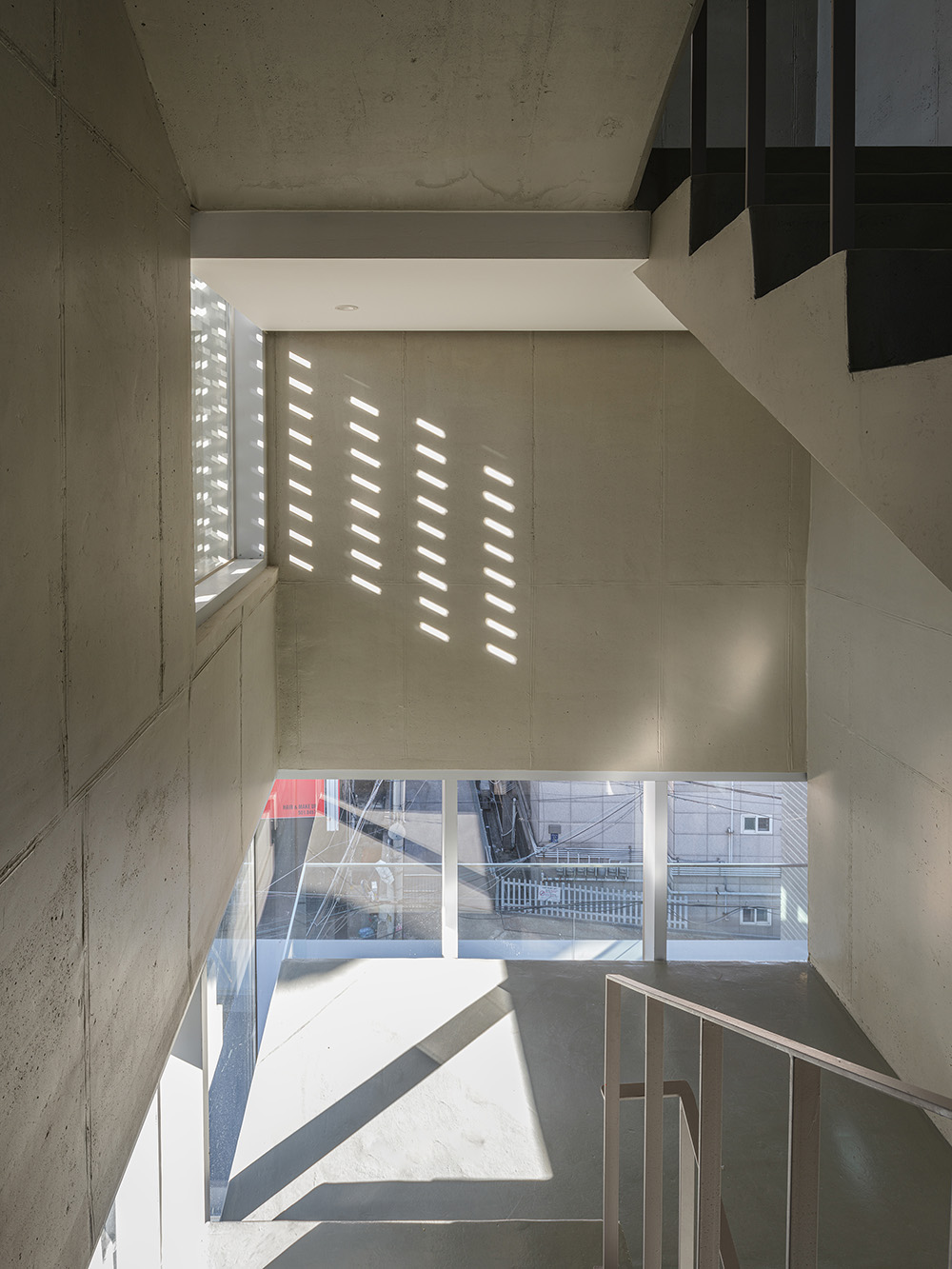 온전한 볼륨으로 쌓아 올린 외관과 지하실의 상황은 다르다. 태생부터 햇빛의 노출이 적고 환기에도 불리한 지하실이 지상층보다 좋은 점 하나가 있다면, 바로 ‘내려갈 수 있다’는 것이다. 즉 방문자의 에너지 소모를 줄이며 공간에 진입할 수 있어 편안하고 기분 좋은 첫인상을 줄 수 있는 기회가 있다. 그래서 지하실 계단을 엘리베이터와 함께 구겨 넣은 계단실이 아닌 하늘을 보며 공간을 내려다볼 수 있는 외부공간으로 계획했다. 지하로 진입하며 점점 넓게 트이는 선큰공간을 통해 방문자가 답답하지 않고 쾌적함을 느낄 수 있도록 했다. 게다가 외부 계단을 조성해 지켜낸 면적은 고스란히 전용실 면적으로 이동하여 넓은 내부공간을 확보했다.