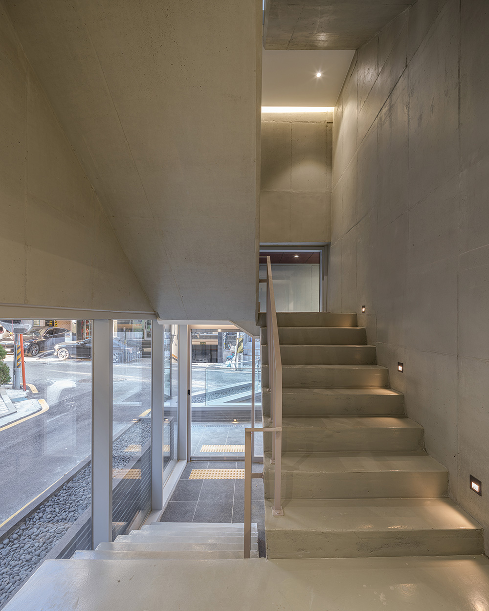 Meanwhile, the condition in the basement is different. An advantage of the basement, which is less exposed to sunlight and has less fresh air, is that people can go down space easily. In other words, there is an opportunity to make a comfortable and pleasant first experience by allowing visitors to enter the space with less energy consumption. Therefore, the architect planned a basement space with stairs as an external space where visitors can look down space and feel nature containing the sky. This is a breakaway design from the stair room that was crumpled together with the elevator. As visitors enter the basement through the wide sunken space, the architect leads visitors to feel comfortable and pleasant.