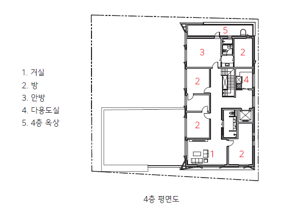 1층과 2층은 카페로 활용되며, 내·외부의 완충 공간으로 자연스럽게 연결했다. 외부에서 완충공간을 지나 중정으로 들어서면 작은 화단과 텃밭을 통해 자연과 교감할 수 있다. 내부는 천장고를 높여 개방감을 극대화했다. 이러한 구조는 주택의 개방성과 사적인 공간을 동시에 만족시킨다. 3층은 거실, 부엌, 화장실 등 기본 공간을 배치해 손님이 왔을 때 접근성을 높였으며, 작은 정원을 조성해 자연을 느낄 수 있는 공간을 마련했다. 4층은 완전한 가족 구성원들만의 주거 공간으로 4층에 별도로 거실을 두어 가족 간의 소통을 원활하게 했다.