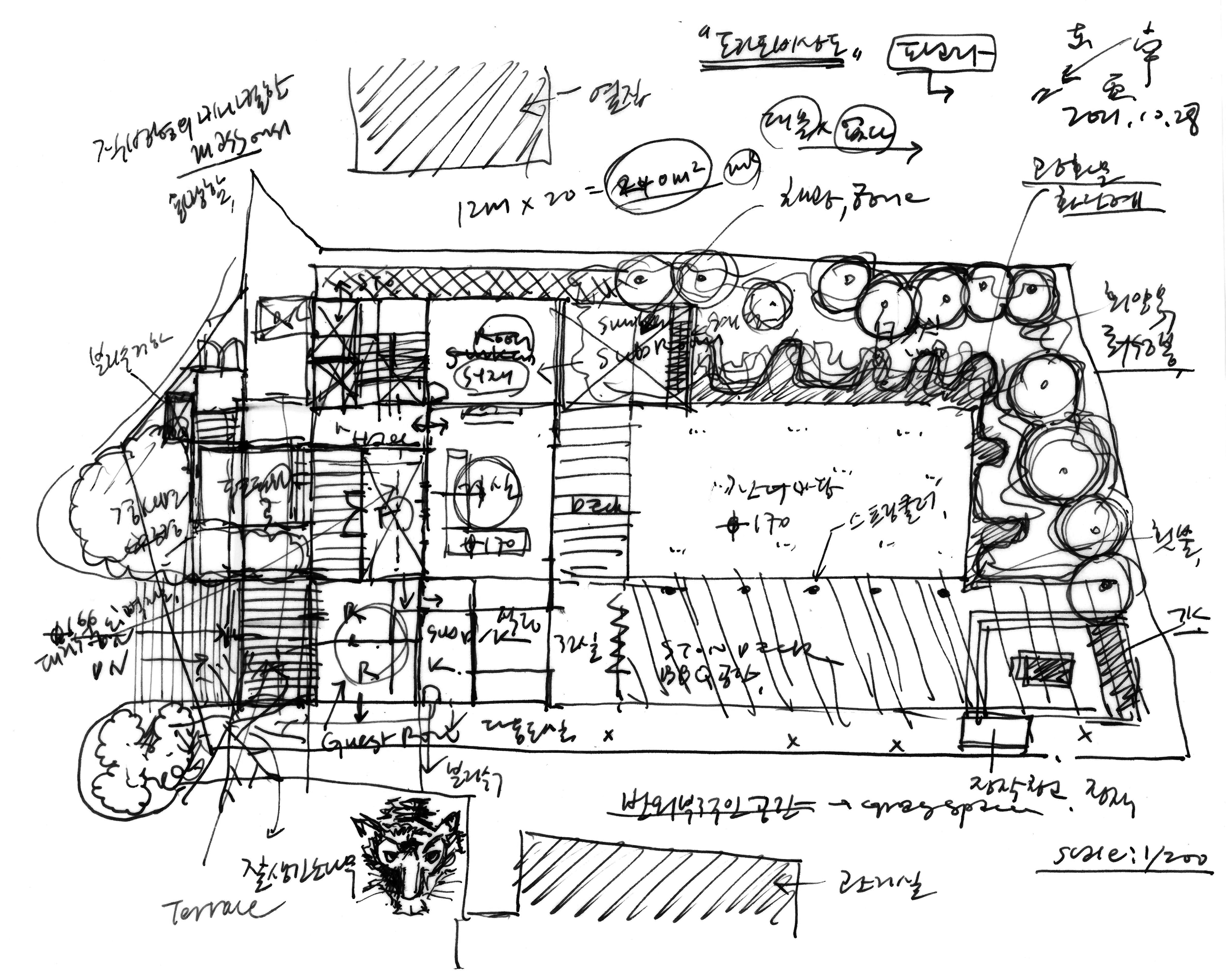 “혹시 원하셨던 것이 이런 집인가요?” 첫 계획안을 펼쳐놓고 묻자, “와~ 마음에 쏙 들어요. 이대로 짓죠” 하는 답이 돌아왔다. 그렇게 계획안은 단 한 차례의 작업으로 마무리 되었다. 건축주와 건축사의 마음이 통한 걸까, 아니면 건축사의 능력치가 신(神)의 경지(?)에 오른 걸까? 건축주에게 제시한 최초의 계획안이 일부 기술적인 부분을 제외하고는 그대로 완성안으로 채택되는 경험을 했다. 단 한번에, 이래도 되는 건가? 그래도 뭔가는 바꿔야 하지 않나? 다른 더 좋은 안은 없나? 별의 별 생각이 다 들었지만, 사실은 나도 처음 그린 스케치에 마음이 꽂혀 있던 터였다.