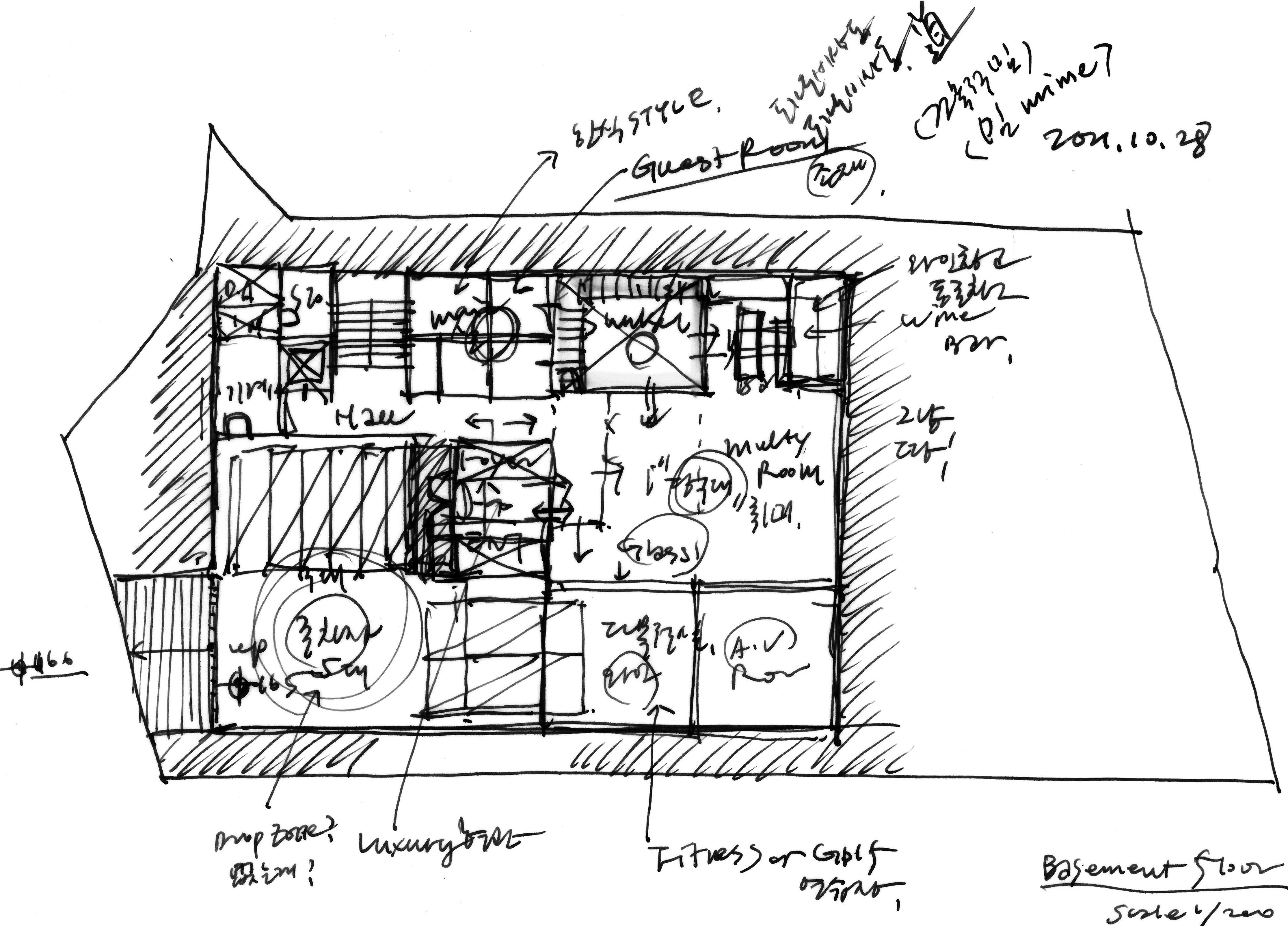 지상층이 가족 전용의 프라이버시 공간이라면, 지하층에는 손님들이 쉽게 접근할 수 있는 공간들이 배치됐다. 주차장으로 통하는 서양주택의 로비(Foyer) 같은 현관과 멀티 룸, 바, 운동실과 게스트 룸이 배치되었고, 지하층의 특성상 환기와 채광을 위한 선큰이 두 군데나 설치되어 결과적으로 매우 만족스러운 지하공간이 만들어졌다.