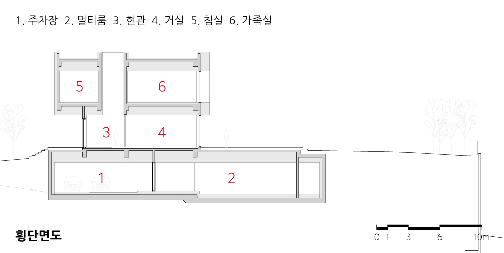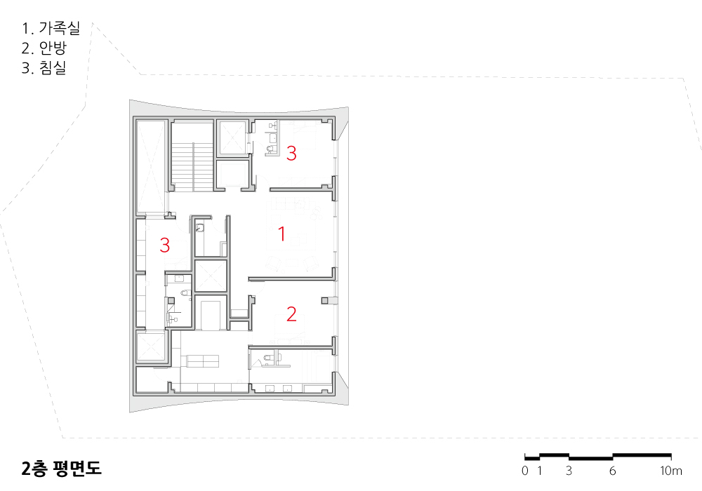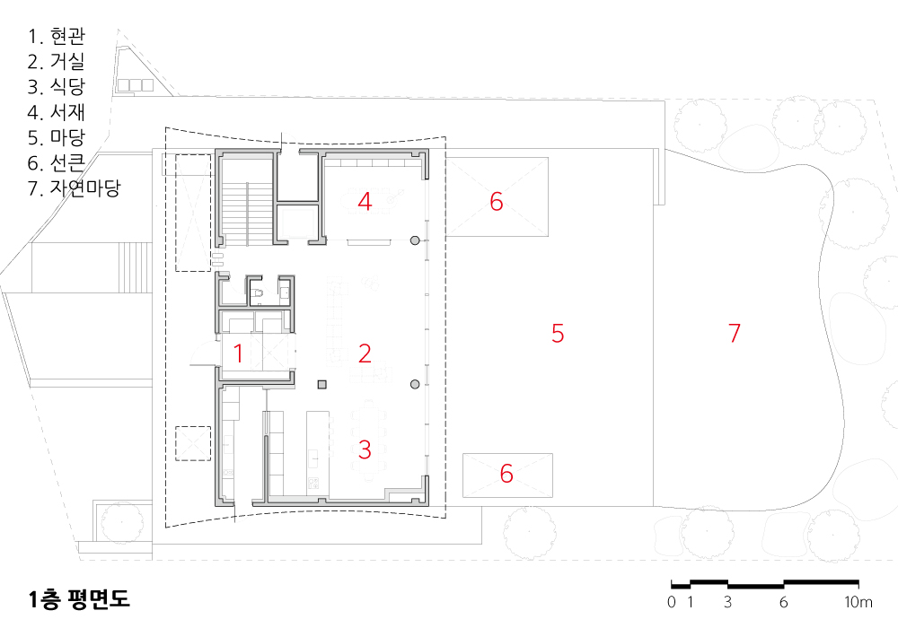 이 주택의 얼개는 무척이나 단순하다. 남북으로 긴 직방형태의 대지는 계획 각론에 나오는 단독주택의 전형적인 동서 방향 배치가 가능했고, 경사진 진입도로는 지하주차장 램프와 맞아떨어져서 편리한 진·출입을 가능하게 했다. 건폐율의 제약을 받는 녹지 지역의 특성에 따라 대지의 남쪽에는 자연스럽게 큰 마당이 자리 잡게 되었고, 1층에는 가족의 생활공간인 거실과 주방, 식당, 그리고 2층에는 침실 존이 배치됐다.