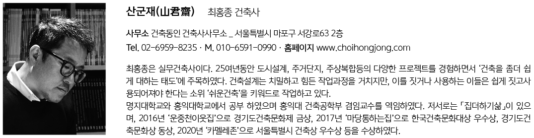 웹툰의 내용을 콘셉트로 시작한 산군재(山君薺)는 신박한 경험을 하는 동시에 ‘쉬운 건축’의 개념이 확대되는 ‘좋은 집 짓기’의 소중한 실현이었다. 그동안 내가 주창해 온 ‘쉬운 건축’의 개념은 설계에서부터 시공까지 본 프로젝트의 진행에 든든한 토대가 되었으며, 그러한 생각으로 지어진 집도 쉽게 사용되기를 바란다.