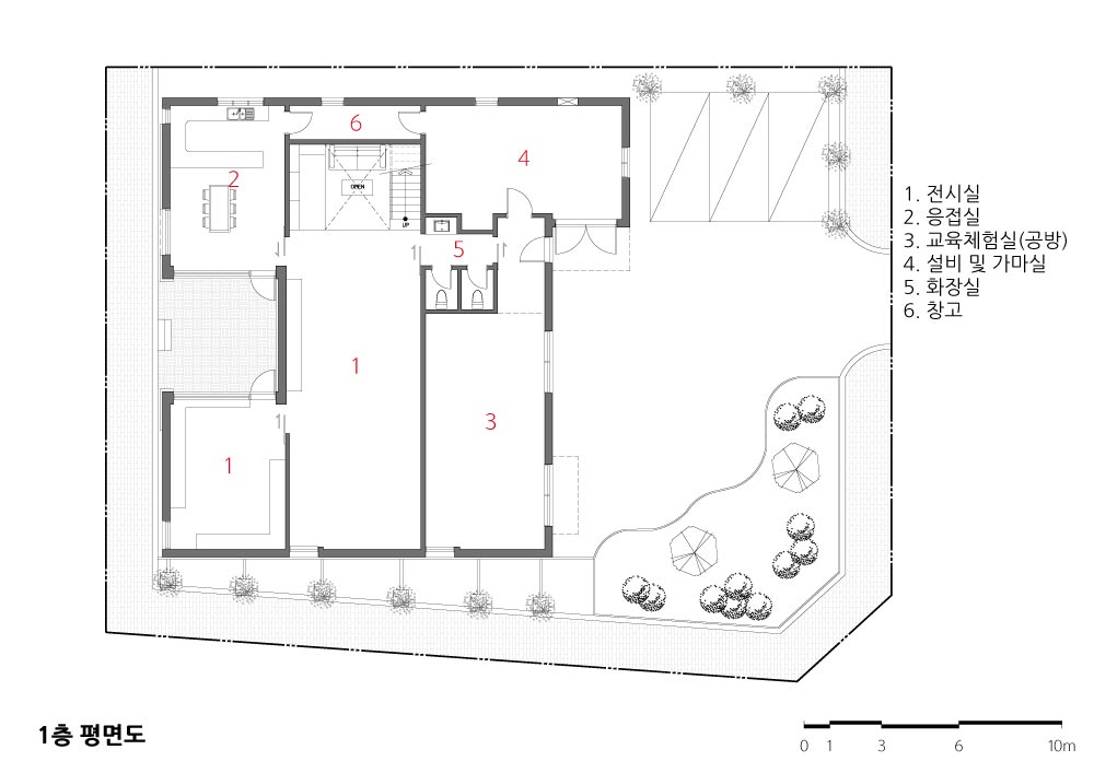 뚜렷한 색감의 도자작품을 담아내면서 한정된 예산에 맞춰 요구된 공간을 만들기 위해 유로폼 노출콘크리트를 주요 내외장재로 사용했으며, 단순한 매스가 내부의 실들이 구 분됨을 따라 외부의 형태도 구분될 수 있게 개구부를 계획했다. 또한 천창부터 1층까지 이어진 보이드 공간과 하늘로 열린 테라스를 계획하여 자연채광과 공간감을 더했다.