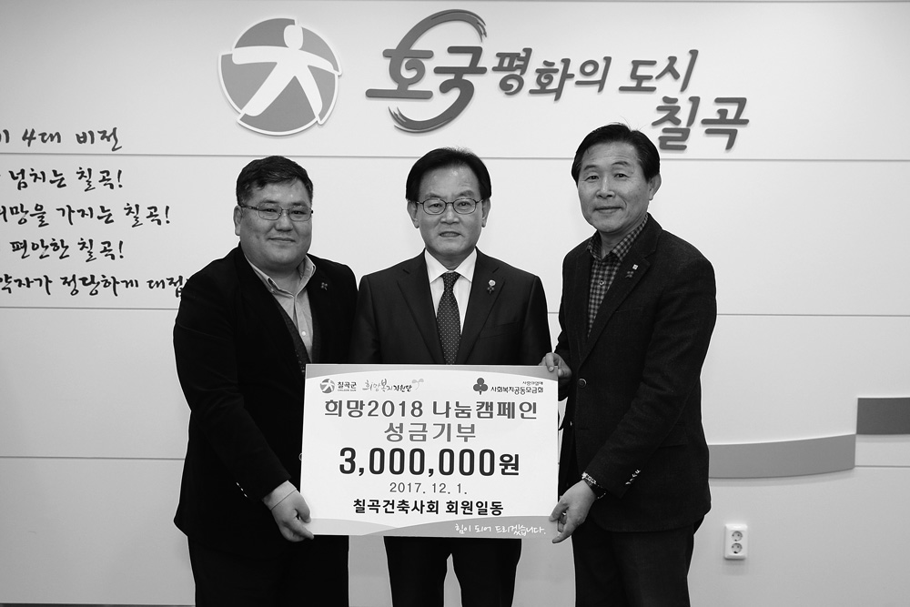 칠곡지역건축사회는 연말연시를 앞두고 칠곡군에 온정의 손길을 전달했다. 칠곡건축사회는 2017년 12월 1일 칠곡군을 방문해 칠곡에서 진행중인 지역 내 어려운 이웃을 돕는 ‘희망 2018 나눔캠페인’ 성금으로 회원들의 뜻을 모은 300만원을 전달했다고 밝혔다.