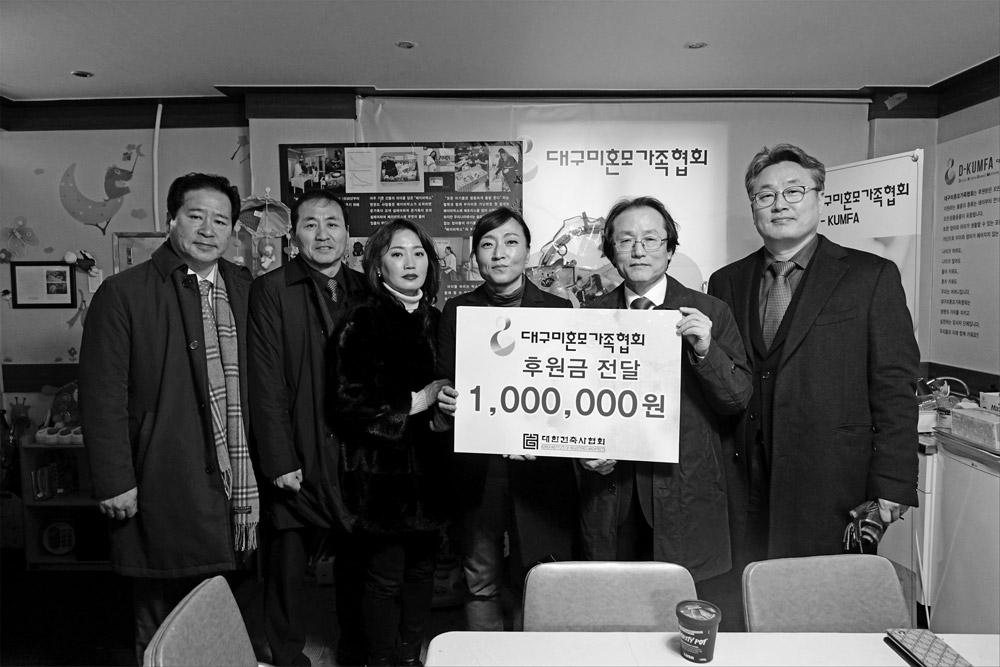 대구광역시건축사회는 연말연시를 맞아 2017년 12월 21일 ‘대구안식원’을 시작으로 ‘대구 미혼모 가족협회’, ‘(사)대구광역시지체장애인협회’, ‘(사)맑고 향기롭게 대구모임’, ‘(사)중부노인복지센터’ 등 총 여섯개 단체를 방문하여 이웃사랑을 실천코자 성금을 전달하였다.