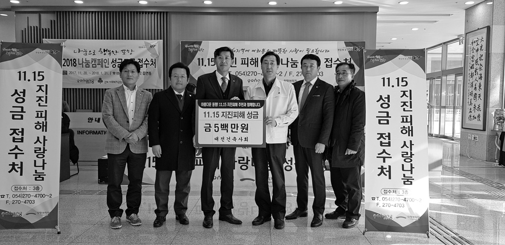 대전광역시건축사회는 2017년 12월 11일 포항시청을 방문하여 포항지진 피해 이재민을 위해 써달라며 대전건축사회 회원 65명이 모은 성금 및 협회 성금 500만원을 전달했다. 성금은 지진피해로 고통을 겪고 있는 포항 지역민들을 위해 쓰이게 된다.