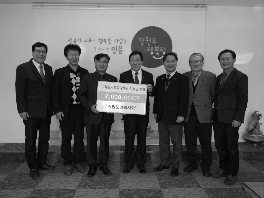 강원도건축사회가 2017년 12월 27일 강원도교육청을 방문해 강원도교육희망재단에 기부금 200만원을 기탁했다. 강원도교육희망재단은 감사의 인사를 전하며 기탁금을 2018년도 작은학교를 활성화 하는 각종 사업에 투입할 예정이라고 밝혔다.