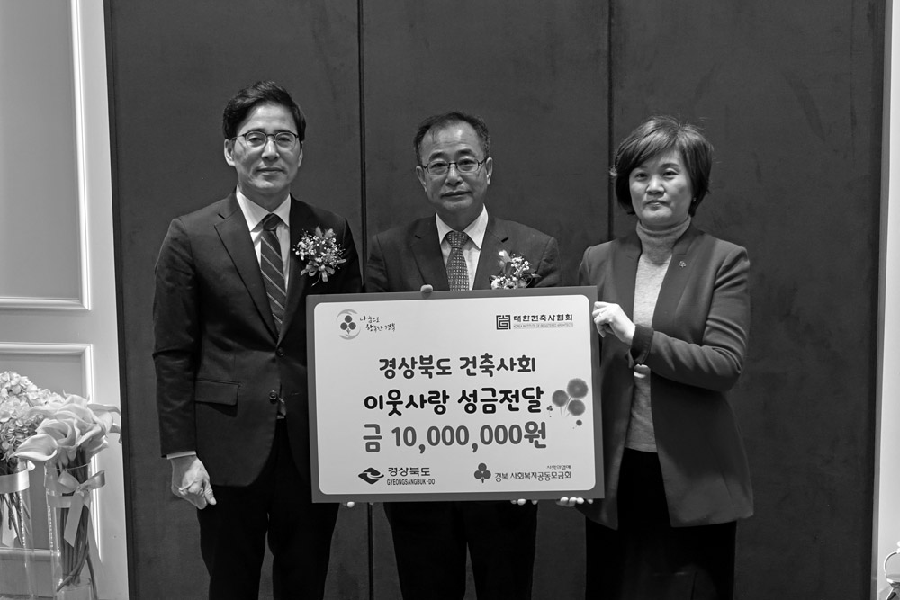 2017년 12월 27일 포항 필로스호텔에서 대한건축사회 경상북도건축사회가 1,000만원, 대한건설협회 경상북도회 1,600만원, 대한전문건설협회 경상북도회 1,000만원 총 3,600만원을 모아 이웃돕기 성금으로 기부했다. 모아진 성금은 사회복지공동모금회에 전달됐다.