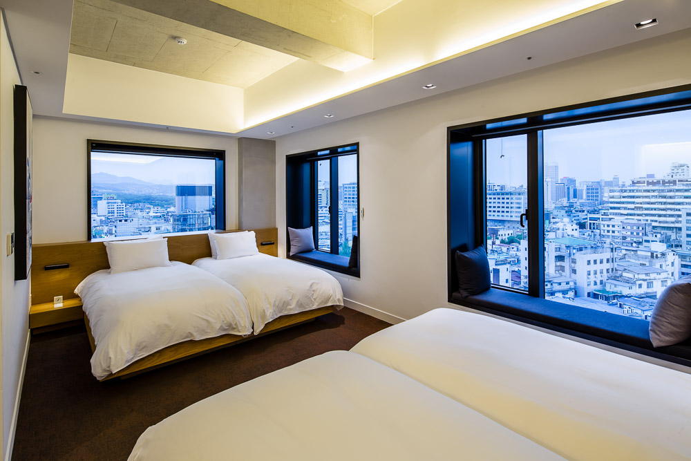 On the other hand, the prominent window seen from the outside is the space of rest and view that you can sit and lie in terms of the use of indoor space. We often traveled overseas, but there were fewer prominent windows than we thought, and accordingly the actions available in windows were limited. The prominent window of the Chungmuro Hotel is big enough for 3 people to sit, and one person can sit against the window alone. In Myeong-dong which has become a tourist attraction, isn’t a window more than that? We were worried about practicality, but the result was more than that.