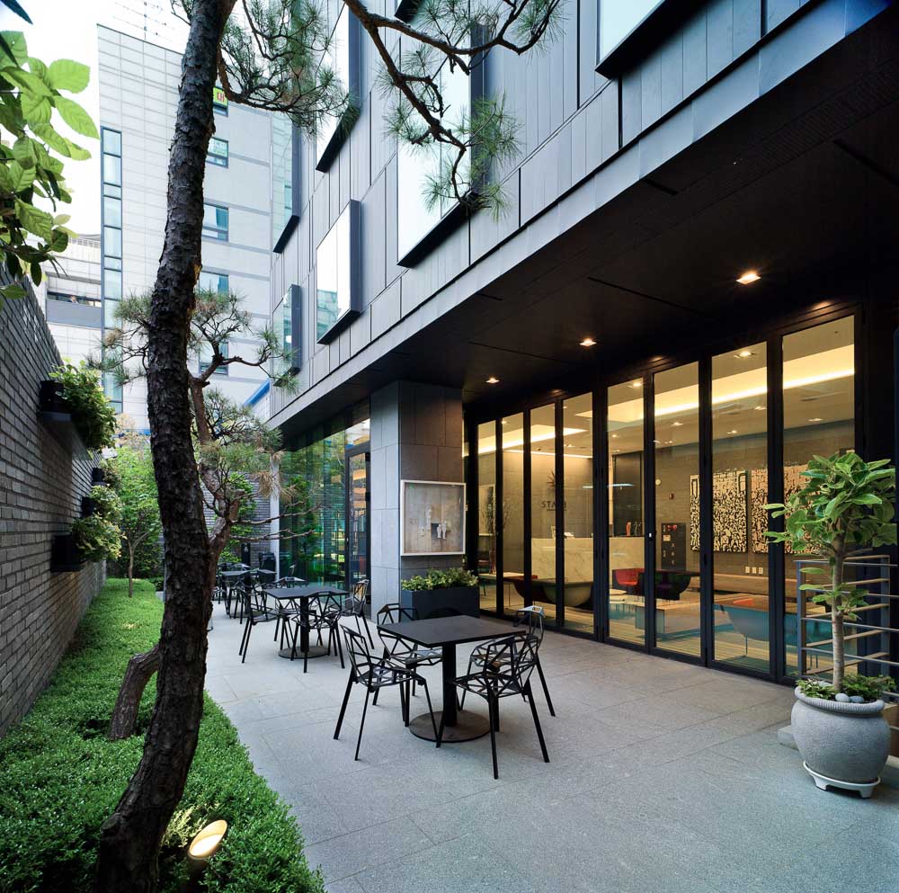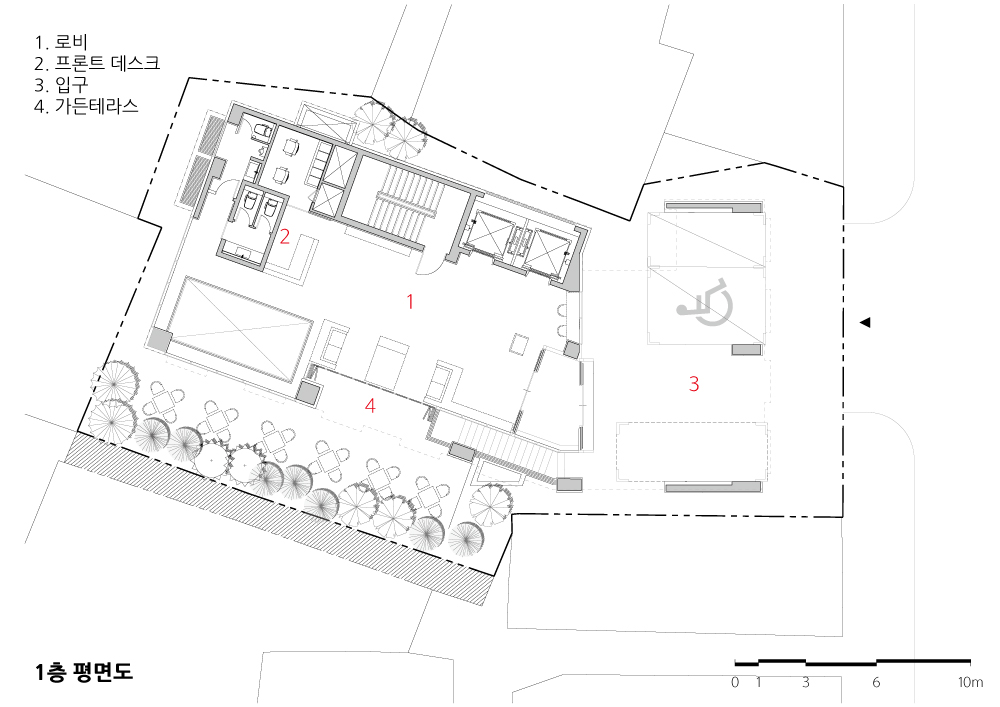 본 프로젝트의 주안점은 크게 두 가지였다. 첫 번째는 작은 필지에 작아 보이지 않는 건물을 올리는 일이었으며, 두 번째는 ‘돌출된 창문’을 설계하는 것이었다. 전자와 관련하여, 크지 않 은 필지의 규모와 달리 보행로에서 1층 로비로 들어가는 입구까지의 거리가 제법 된다. 마치 큰 호텔을 들어가는 듯한 기분을 자아낸다.