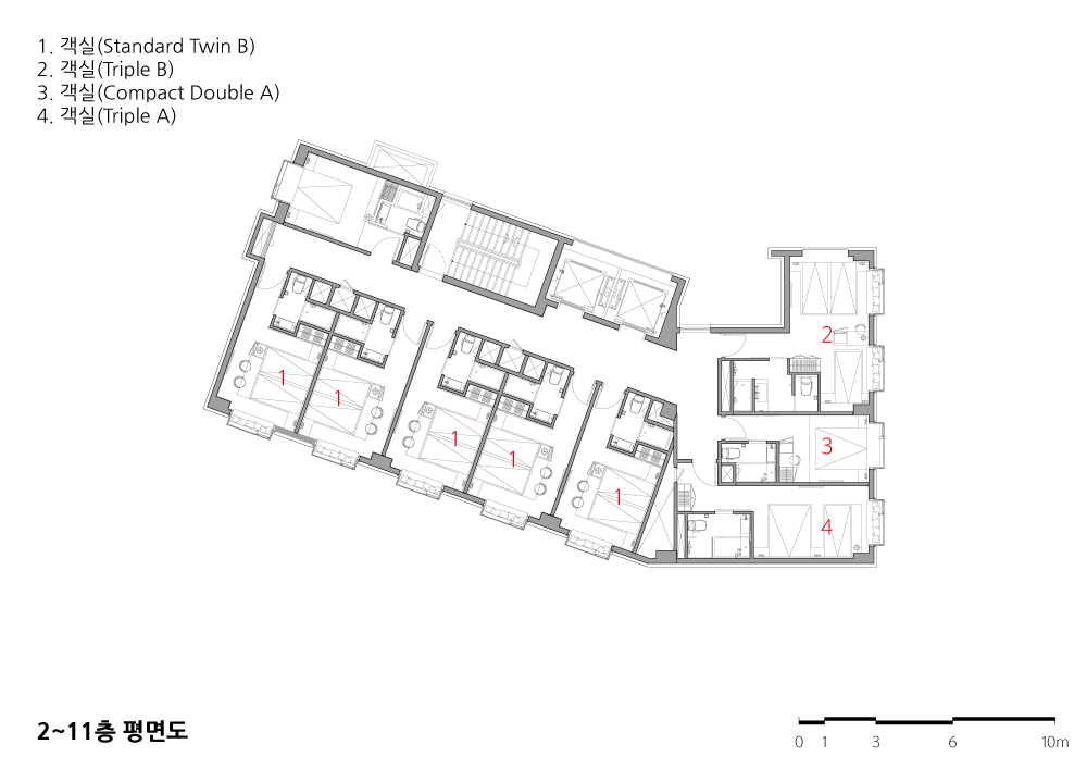 Stay B Hotel is located in the center of Myeong-dong. It is characterized by its very irregular site, which ultimately has a major influence on the irregular shape of the building.