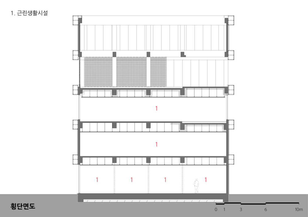 The first layer is zinc that gives the unity of the building, and the second layer has a variety of materials that can give diversity to the frame of the zinc, including punching metal(white, sky blue), stainless steel panel, brick, granite stones(Pocheon stone, Goheung stone), aluminum panel and low-E double-layered glass(green, blue, transparent). Indoor space is visually connected to the outside by glasses, and the outside space is blocked by the brick wall of the 4th floor. I think that the interior space and exterior design created by these different concepts will give various stories and pleasures.
