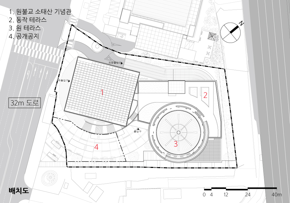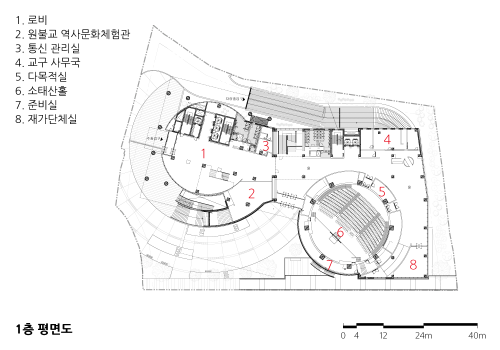 Arrangement of complex facilities with a large floating population on the side of Hyeonchung-ro and religious facilities as a static space along the Han River to maximize visual symbolism comes from an active interpretation of the site that expected the identity of Won Buddhism and the role of landmark. In addition, while the three-dimensional outdoor circulation leading to the Han River enjoys the scenery of the Han River and Namsan, the 'A way of Emptying', engraving the doctrine of Won Buddhism, is connected to the 'meditation space,' a healing space, so as to give meaning to become a place of architectural communication unique to Won Buddhism.