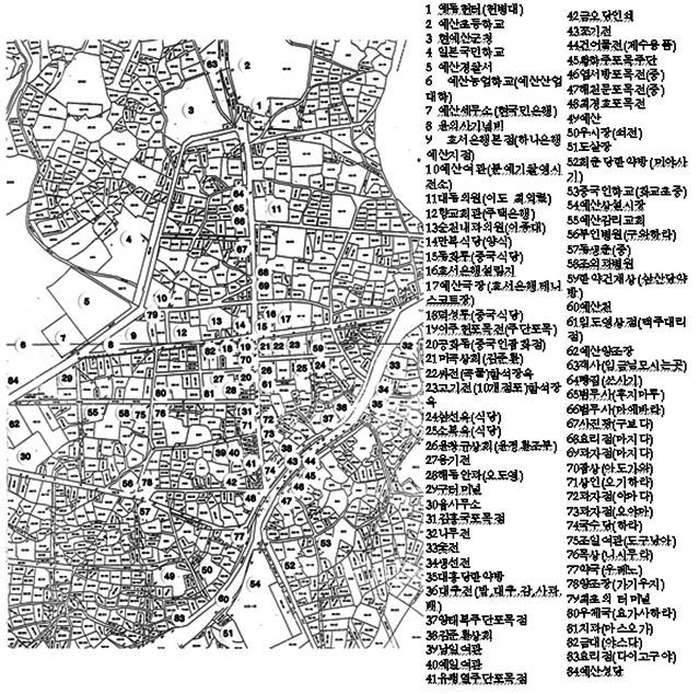 해방 이전과 이후 주요 상업공간이었던 예산 본정통을 비교해 보면, 해방 이전에는 서남쪽, 양쪽으로 시장이 길게 퍼져있는 것을 볼 수 있다. 이는 두 가지 측면에서 볼 수 있는데, 업종과 상인의 수가 증가됨에 따라 시장이 점차 확장되었음을 알 수 있다. 또한 도심부가 본정통을 중심으로 서로 상호적 관계를 유지하면서, 서로 다른 상권이 중복되지 않고 같은 업종과 함께 인접해 있는 것을 볼 수 있다. 이는 중심상권이 확장되면서 혼재되어 있는 업종들이 같은 상업종을 갖고 있는 사람들과 유대성이 강화되고, 시장영역도 유사한 업종끼리 새로운 영역으로 확장하며, 식민정책적으로도 장려되었기 때문에 다른 도시와 마찬가지로 예산에서도 이러한 발전이 나타난 것이다. 이것은 우리의 재래시장이나 장시와 한성의 시전(육의전)에서 볼 수 있는 바와 같이 각기의 업종이 분리된 형상으로 배치가 이루어진 것과 유사함을 알 수 있다. 결과적으로 예산 본정통 내에서, 특히 구시가지 내에 상업활동이 활발히 성업했으며, 도시전체가 상업활동의 공간이 될 만큼 상업의 종류와 규모가 컸다는 것을 짐작할 수 있다.